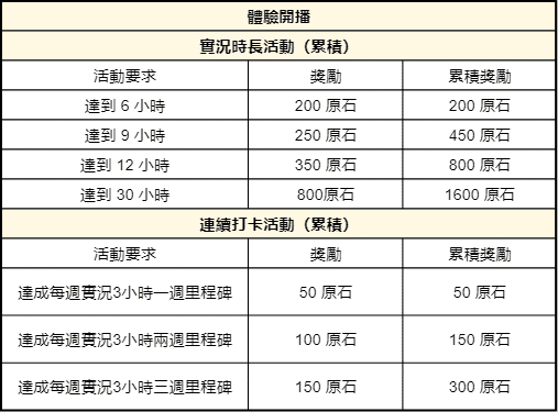 補充說明:實況達到6小時可獲得200個原石獎勵。實況達到9小時可獲得450個原石獎勵。實況達到12小時可獲得800個原石獎勵。實況達到30小時可獲得1600個原石獎勵。
