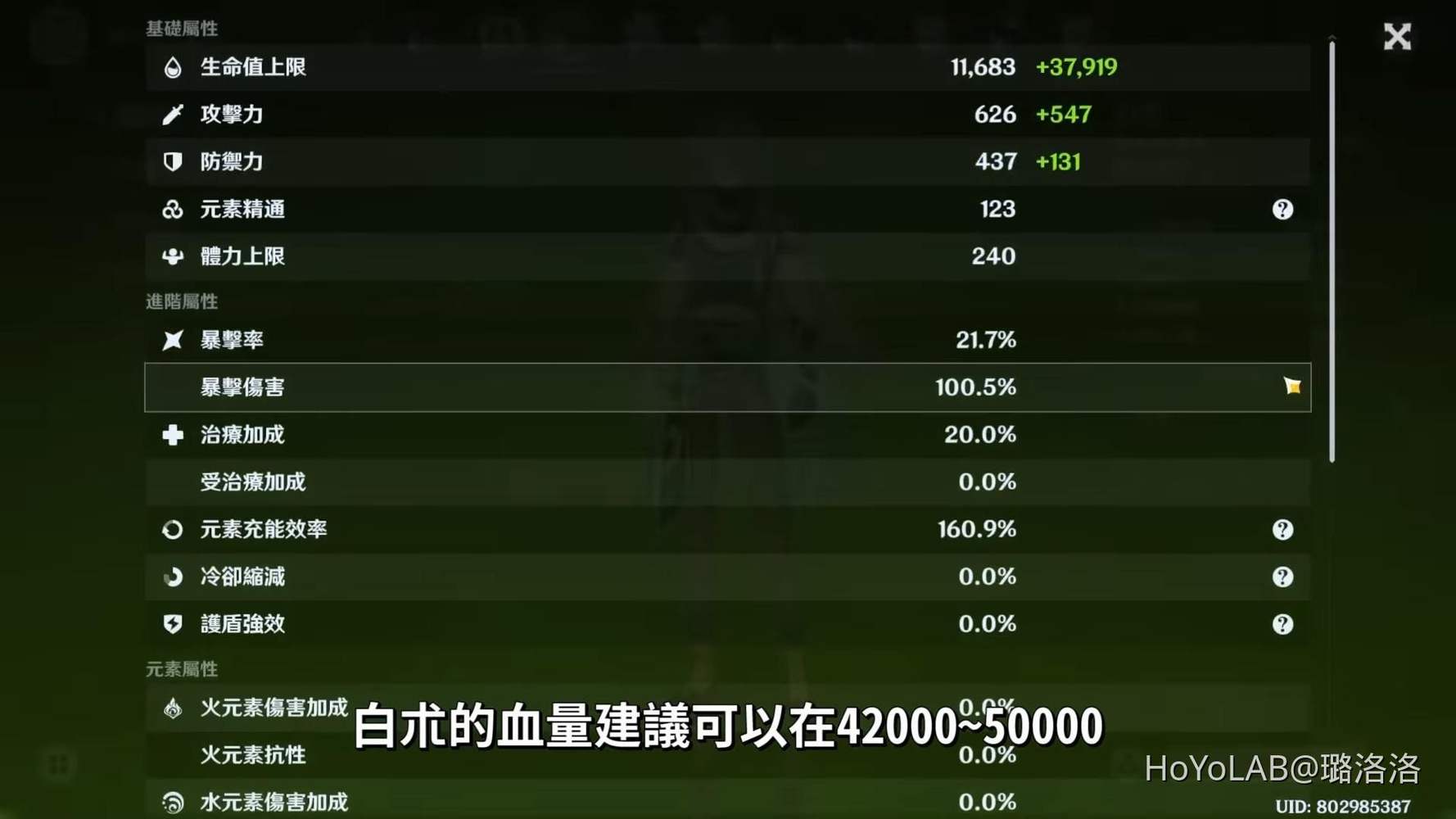 畢業面板參考,白朮的血量建議可以在42000~50000,超過50000的話草元素反應增傷就不會再有更多加成,而也因為固有天賦2的增傷與角色的元素精通屬於同一個乘區,因此也會隨著數值越高越有稀釋的可能性,所以低標也可以設定在42000左右,因此若覺得增傷有被稀釋的感受的話,也可以從白朮的治療量做提升,就不用硬要堆滿50000血量。大概就是少10%綻放傷害和4%的激化傷害。0命的白朮會建議元素充能要在200%~220%,1命的白朮則是需要180%~200%,有1命又有專武的話則可以在160%~180%。
