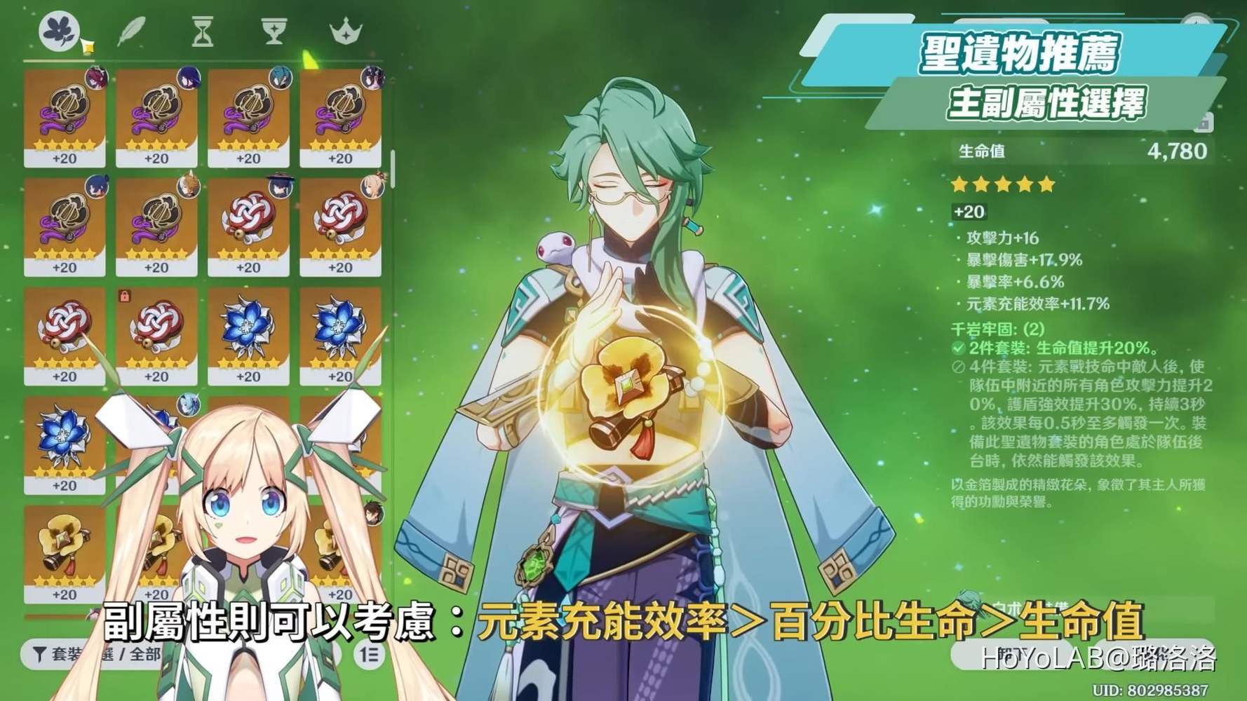 白朮的聖遺物主副屬性選擇,時之沙推薦生命值,大招能量不夠無縫循環則可以選擇元素充能效率,空之杯選擇生命值,禮之冠選擇生命值,如果有不錯的治療頭,附帶生命值百分比副屬性,也可以選擇治療加成頭換來更多的治療量。副屬性則可以考慮:元素充能效率>百分比生命>生命值。