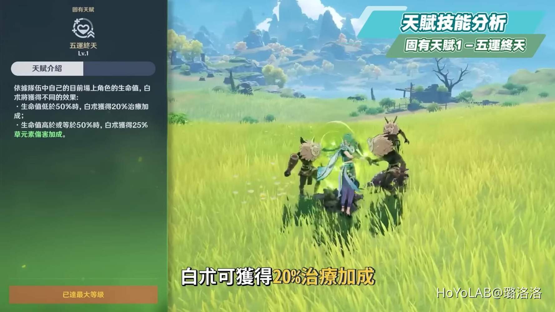 解鎖固有天賦1,會根據白朮血量的不同,獲得不同的效果,當場上角色生命值低於50%,白朮可獲得20%治療加成、當場上角色血量高於50%,白朮獲得25%草元素傷害加成。白朮其實並不是一個能夠打傷害的角色,因為白朮主要堆疊的面板屬性為生命值,要提升白朮傷害的話會需要堆疊元素精通,但這樣就會犧牲掉身為奶媽的恢復量,非滿命的白朮都不用去考慮讓白朮打傷害,因此這個25%草元素傷害加成主要加得並不多。
