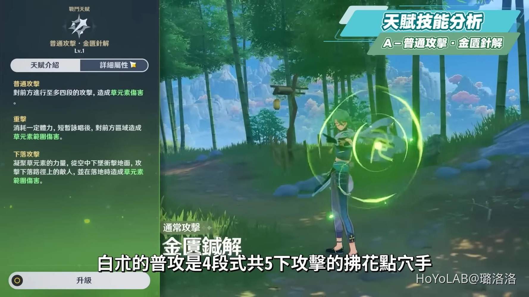 白朮的普攻是4段式共5下攻擊的拂花點*手,每一下普攻、重擊與下落攻擊都屬於弱草元素附著,一般情況下白朮並不太會是在前台站場打草元素的角色,而且白朮的普攻距離很短,類似鹿野院平藏的近戰法師,而作為一個奶媽來說,白朮的普攻是可以不用升級的。