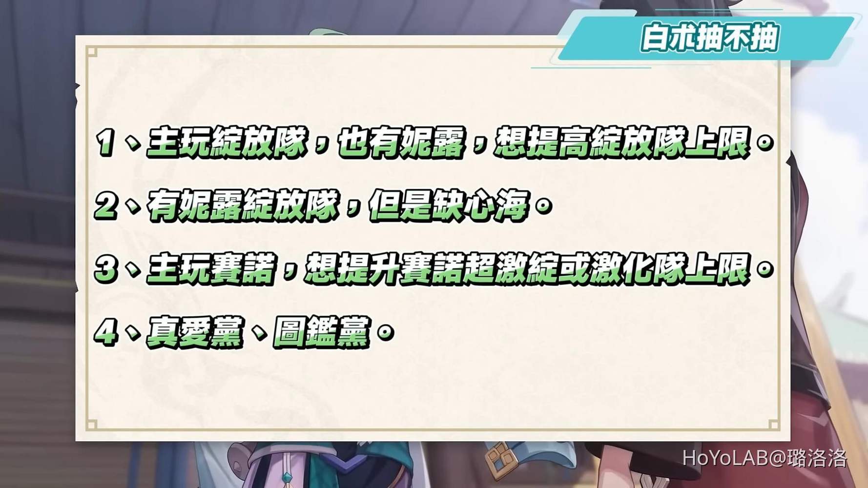不在以上條列的情況下,或是主玩激化隊的,都可抽可不抽。雖然白朮看似想抽的人不多,但白朮提供給喜歡玩綻放隊的人有更安逸的奶媽位,而且總體綻放隊成員的命座和專武要求也都不高,適合想通關深淵的平民玩家,加上近期又剛好有另外一款《星穹鐵道》,對於**的玩家來說,其實也有可能抽完另外一邊的T0希兒就無暇顧這邊的卡池了。所以這時候來一個不算是**角的角色來說,也算是一件好事。
