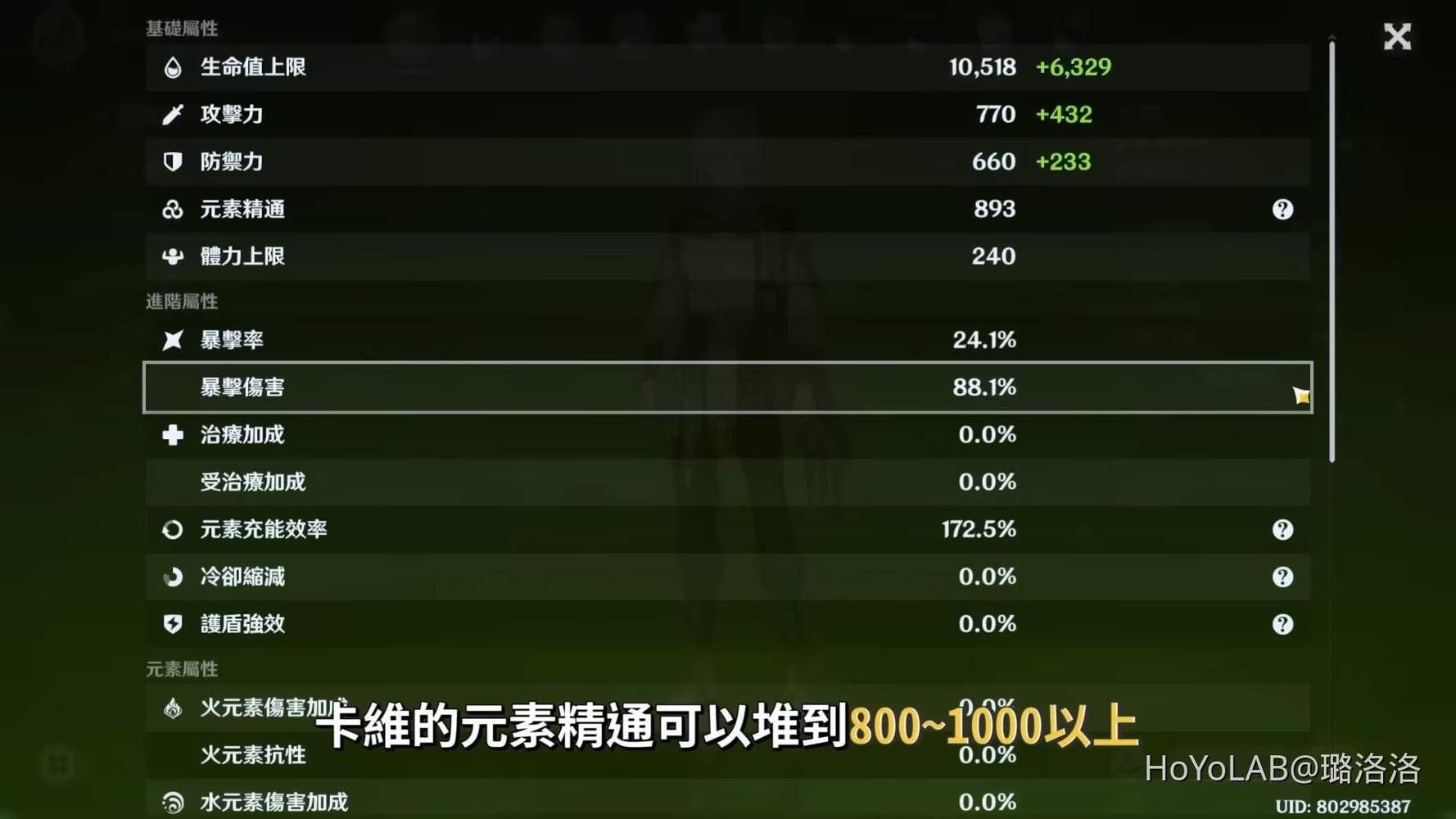 畢業面板參考,卡維的元素精通可以堆到800~1000以上,越高越好,若是將卡維放置在單草的陣容的話,元素充能效率建議需要在210~230%以上,而若是雙草陣容的話則會建議在180~210%左右。才能使卡維的大招循環跟得上。