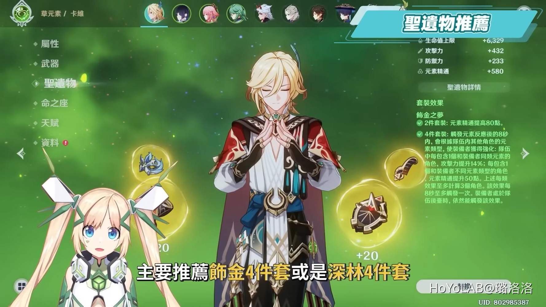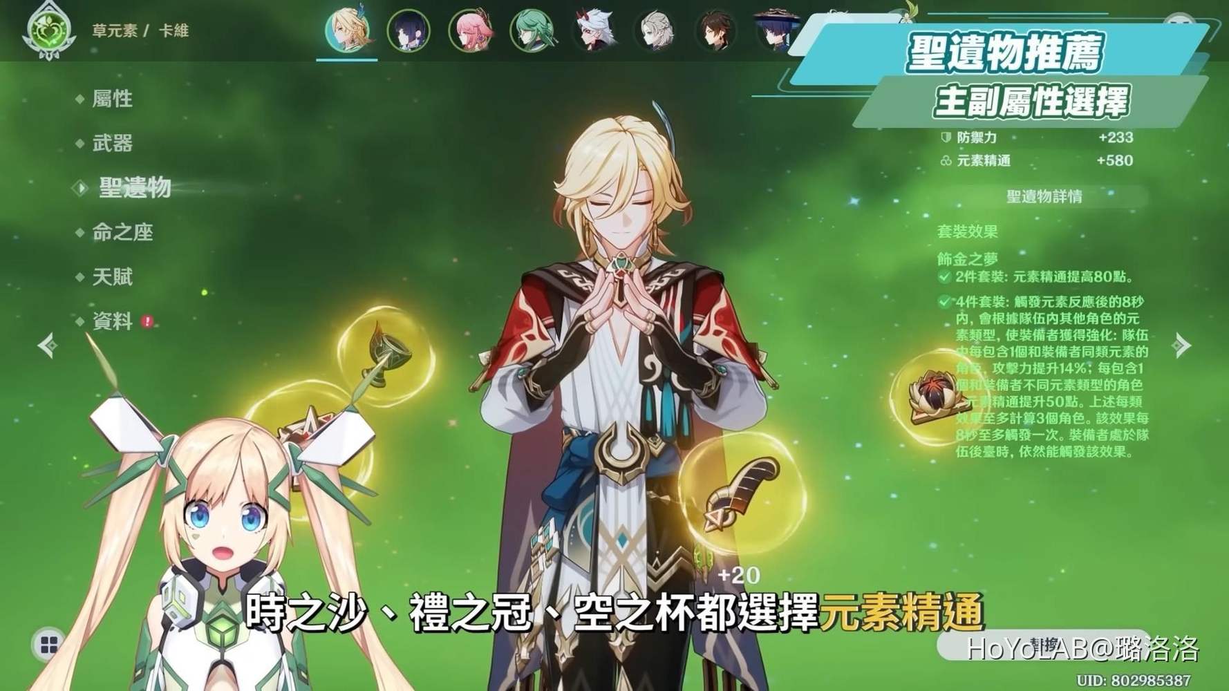 聖遺物主副屬性選擇方面,時之沙、禮之冠、空之杯都選擇元素精通,而若是大招能量80點的需求在元素充能面板上不太足夠的話,也可以將時之沙換成元素充能,副屬性選擇方面則可以考慮元素精通和元素充能,而雙暴的部分有的話也可以加減堆一些。