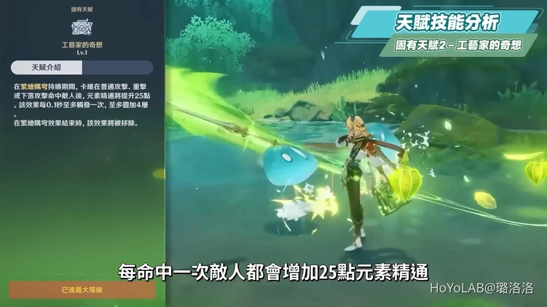 解鎖固有天賦2,在卡維開Q大招期間的普攻、重擊、下落攻擊,每命中一次敵人都會增加25點元素精通,最多累積4層共100點。