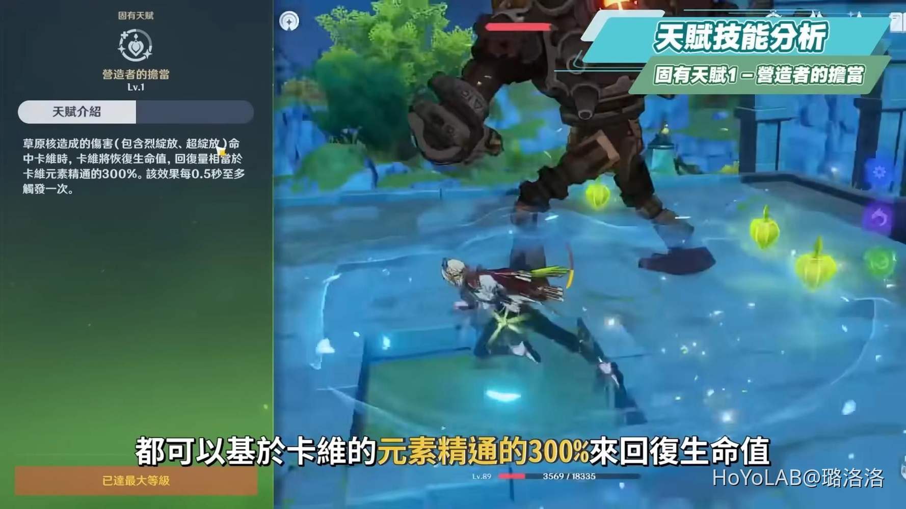 解鎖固有天賦1,場上的所有綻放傷害使卡維受傷的話,都可以基於卡維的元素精通的300%來回復生命值,也包含妮露的豐穰之核爆炸後的傷害。不過若是在0.5秒內同時受到多種綻放反應傷害的話,只能觸發1次治療效果。