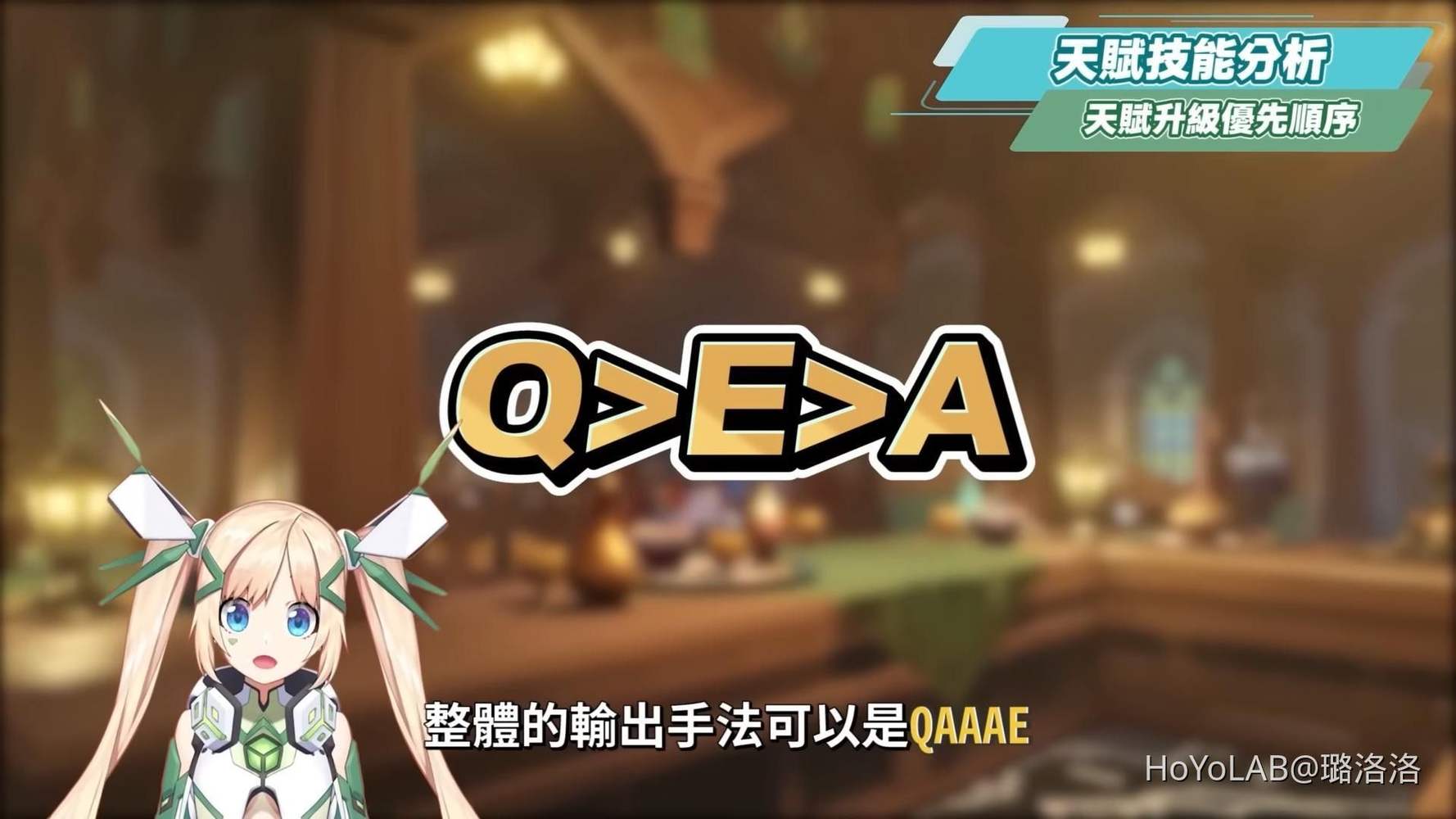 天賦升級優先順序方面,優先升級卡維的核心天賦Q元素爆發,若是只將卡維當作掛草工具人,E和A可點可不點,而若是還想要加點升級增加技能傷害則可以再升高E,最後A。整體的輸出手法可以是QAAAE。