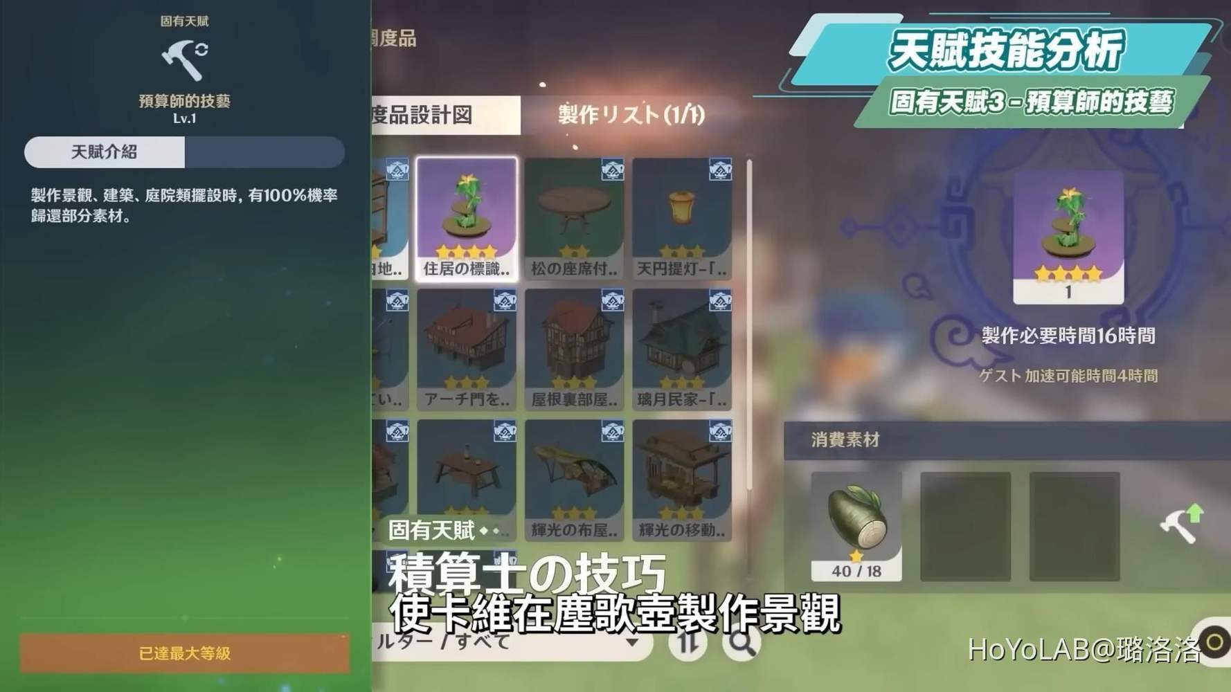解鎖固有天賦3,使卡維在塵歌壺製作景觀、建築、庭院類擺設時,可以返還部分素材,不同於宵宮的塵歌壺傢俱類別。