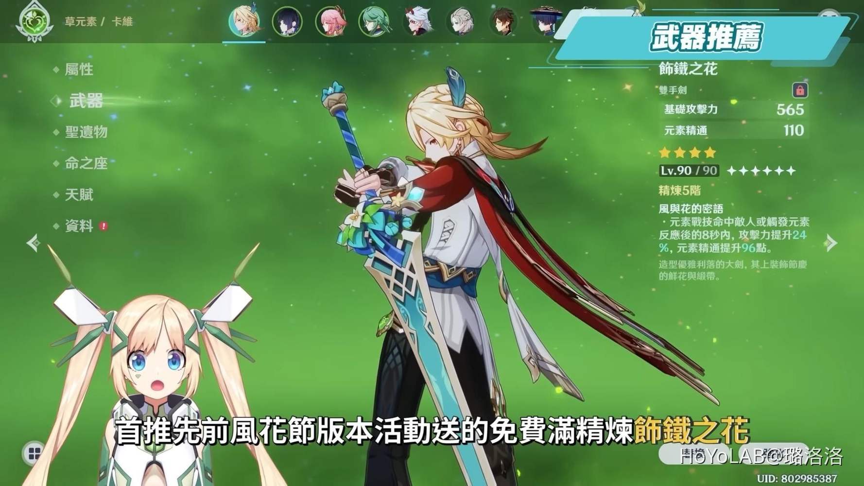 卡維的武器推薦可以選擇元素精通主屬性相關的大劍,首推先前風花節版本活動送的免費滿精煉飾鐵之花,其次是需要用抽才得獲得的瑪海菈的水色,其他還有四星的雨裁、以及三星的沐浴龍血的劍,另外可以考慮的就是元素充能相關的武器,像是森林王器,拾取武器效果掉落的葉子還可以加元素精通,天空之傲、祭禮大劍、西風大劍等等,選擇西風大劍則會建議暴擊率需要堆高。