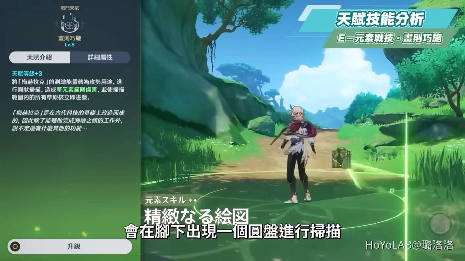 卡維施放元素戰技後,會在腳下出現一個圓盤進行掃描,掃描範圍內若是有敵人,則會對敵人進行草元素範圍傷害,造成弱草元素附著,每次命中敵人可以產生2顆草元素微粒,而範圍內有草原核的話,則草原核會立即引爆,此外E技能的掃描後直接引爆的傷害並不是觸發元素反應,所以還是要看這個草原核是由誰觸發綻放反應的,因此與卡維的元素精通無關。而如果掃描範圍內有3顆以上的草原核,因為綻放相關反應只能使單個敵人和角色在0.5秒內受到2次傷害,所以在這裡也可以看到同時引爆3顆草原核時,卡維也只會受到2個草原核的爆炸傷害。另外雖然由我方角色觸發的超綻放反應傷害不會炸到自己,但若是由敵人所觸發的超綻放反應使會使我方角色造成傷害的哦。