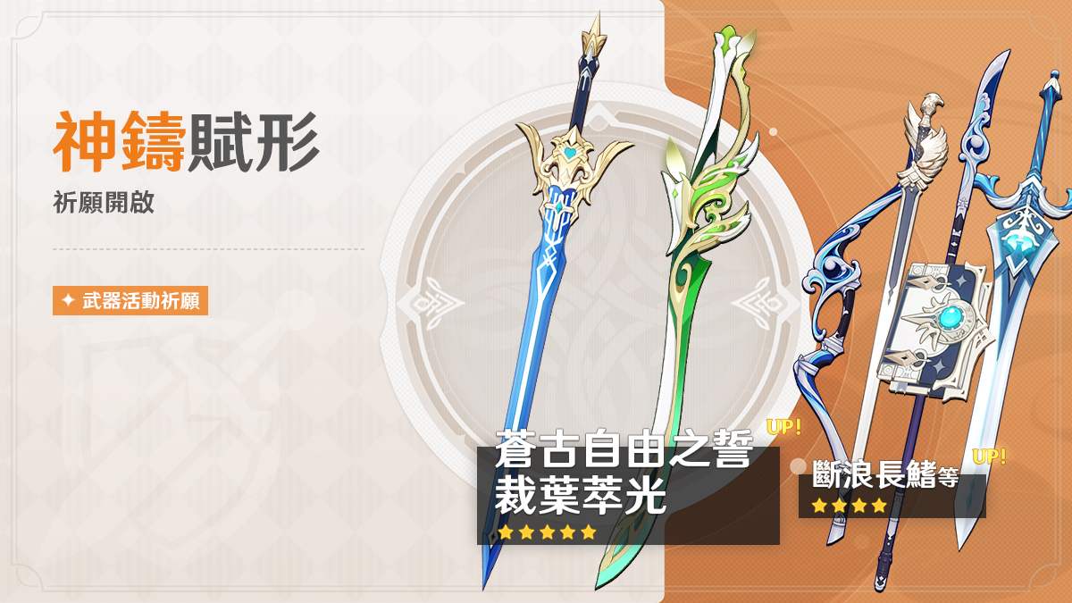 「神鑄賦形」祈願:「單手劍·裁葉萃光」、「單手劍·蒼古自由之誓」機率UP!