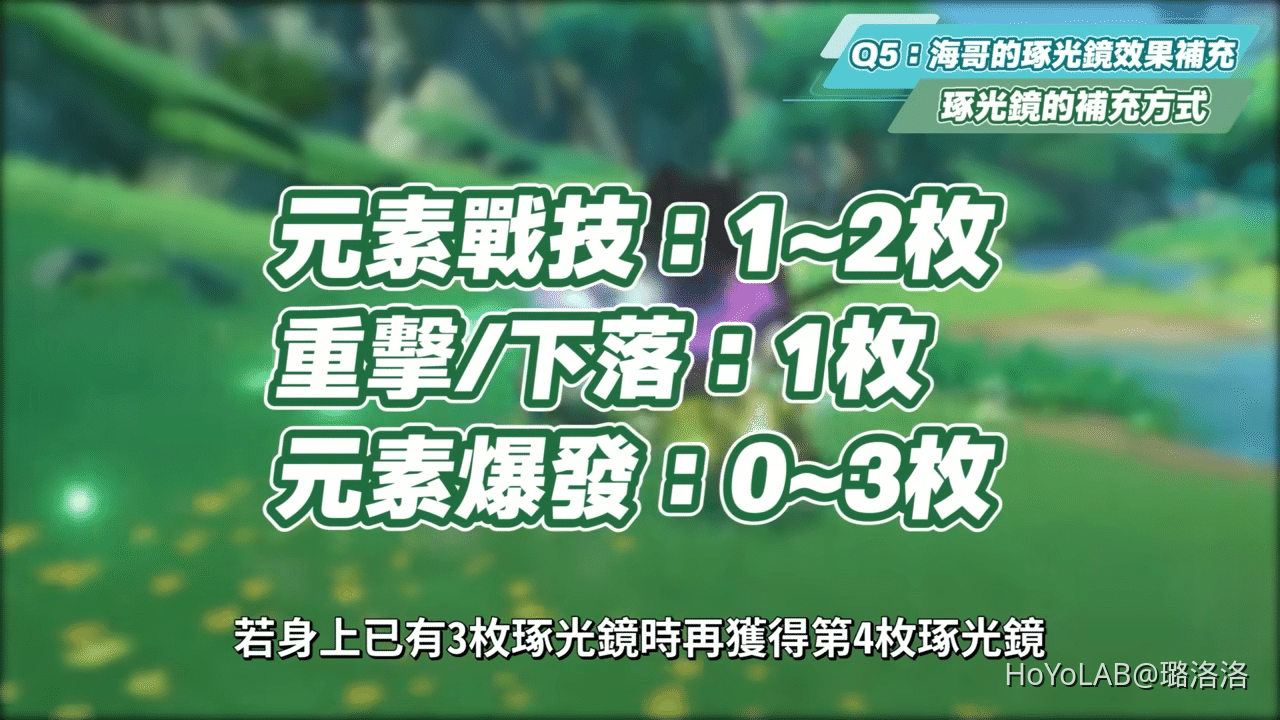 知道琢光鏡數量3枚時傷害最大,因此我們使用海哥的關鍵就是要盡量維持琢光鏡在3枚的數量,因此再來就是要了解一下海哥的琢光鏡有哪些補充方式,首先是戰技使用時會產生1~2枚、再來是重擊或下落攻擊也會產生1枚、最後是開元素爆發後會依照身上琢光鏡數量返還0~3枚,若身上已有3枚琢光鏡時再獲得第4枚琢光鏡,則會覆蓋掉第1層琢光鏡,並且刷新存在的時間。