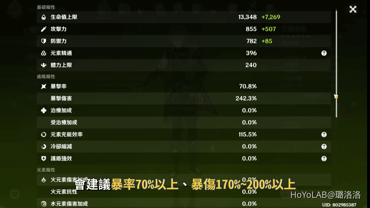 海哥的畢業面板要怎麼看呢?若是有配置雙暴類武器,會建議暴率70%以上、暴傷170%~200%以上,而若是沒有配置雙暴類武器,則會建議暴率70%以上、暴傷140%以上,元素精通方面最低要求至少260~300,這個數值是指任何戰鬥中效果都未觸發的情況下,通常只要有一個元素精通沙就差不多能夠使這個數值落在300~460左右了,再搭配有納西妲或是其他聖遺物或命座效果都很容易輕易就破千以上精通,而此時攻擊力也會大約落在1400左右。