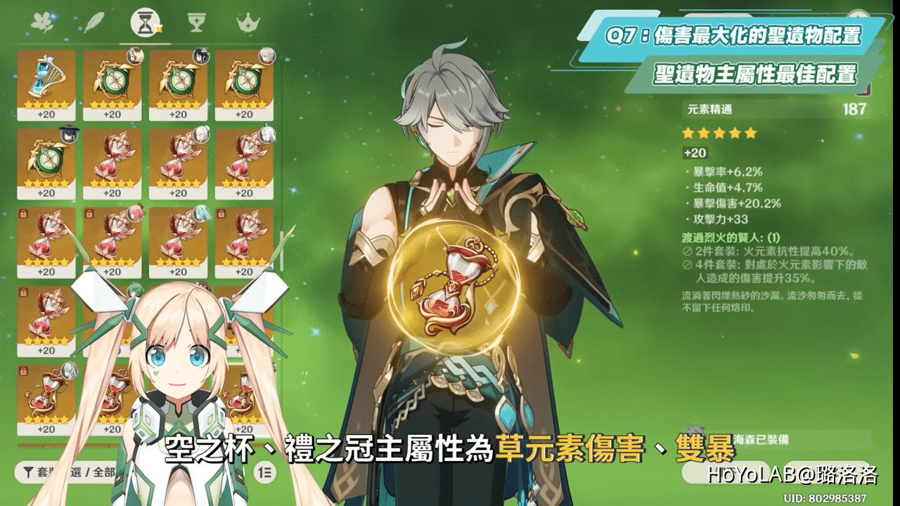 在海哥的面板屬性中,元素精通是可以透過多種方式來增加,但雙暴屬性要獲取則比較困難,同時在海哥的激化傷害中,雙暴是最優先的數值,其次是元素精通,最後是攻擊力,因此最終的聖遺物配置不外乎就是會落在空之杯、禮之冠主屬性為草元素傷害、雙暴,時之沙的選擇上為元素精通或攻擊力了,海哥主要出現在的主流隊伍中,非滿命通常放置在打高下限的超綻放隊、滿命則可以打高上限純草雷配置的蔓激化隊,因此元素精通除了影響這些草元素反應傷害之外,也會透過被動天賦的效果再增加海哥的技能傷害,所以大部分情況下最泛用且最推薦的時之沙主屬性選擇會是元素精通,而若是在蔓激化覆蓋率比較不高、偏向屬於打直傷的草元素傷害,這時才會是攻擊力數值優於元素精通,不過一般情況下海哥不太會打直傷,除非是在雙水配置的超綻放隊中,蔓激化觸發率較低的情況下,因此一律都穿元素精通時之沙最簡單,而要追求傷害量最高的話,又會是以精/草/暴的配置傷害最高,但若是還沒有刷到合適的草傷杯或是雙暴頭,也能稍微先用元素精通屬性的暫時過渡使用。像是精/草/精、精/精/暴這種配置。
