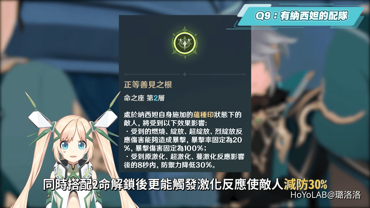 再來也分享一些海哥搭配納西妲的一些主流隊伍推薦。雖然說海哥可以透過許多管道給自己增加精通,配隊上也會靈活許多,但在有納西妲提供高精通的情況下,能夠輕鬆直接讓海哥吃滿被動天賦2的增傷上限,同時搭配2命解鎖後更能觸發激化反應使敵人減防30%,傷害更高,提升更多輸出上限。