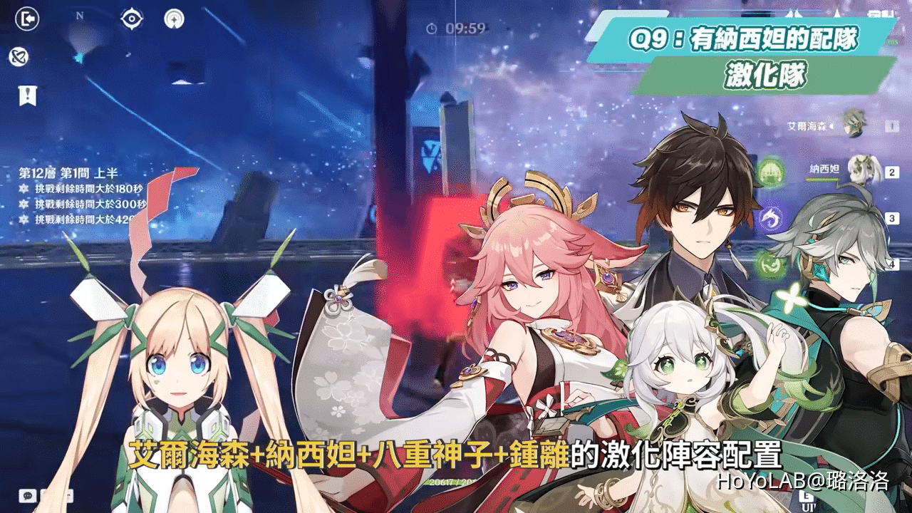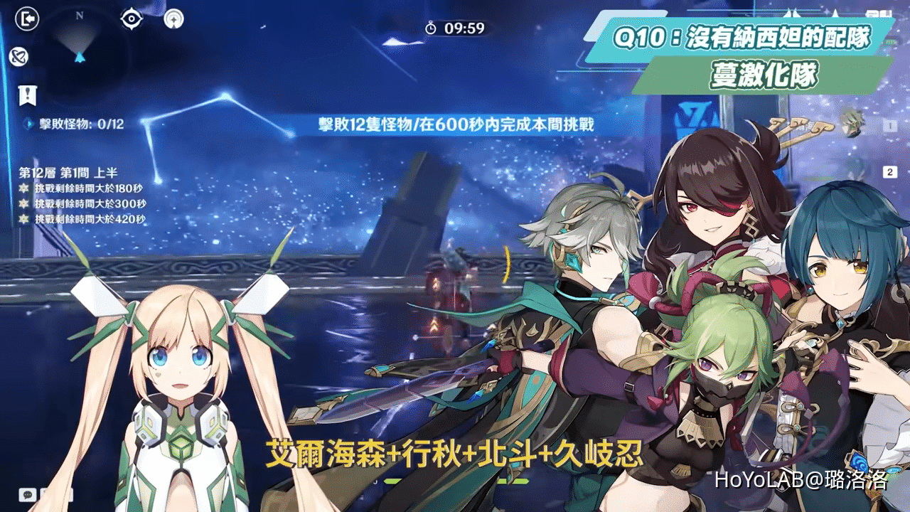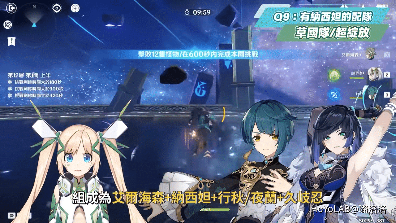 草國隊的陣容好用又百搭,組成為艾爾海森+納西妲+行秋/夜蘭+久岐忍,搭配艾爾海森作為站場位,也可以讓納西妲不用挺著小身子站場扛傷害,也是許多0命艾爾海森使用率最高的陣容,並且雙草+單水+單雷的配置也會讓激化觸發率較高。而若是納西妲需要去其他隊伍幫忙,也能再換成夜蘭組成雙水的超綻放,透過艾爾海森的前台極高的草附著頻率,甚至也可以做到壓制行秋+夜蘭的雙水轉成草元素基底。而在這樣的雙水陣容中的艾爾海森,也是會比較屬於低練度的情況下較適合的配置,因為在這樣的雙水陣容下,草原核所產出的數量較多,蔓激化的覆蓋率並不高,傷害主要會落在行秋、夜蘭的水元素直傷,和觸發超綻放的久岐忍身上。