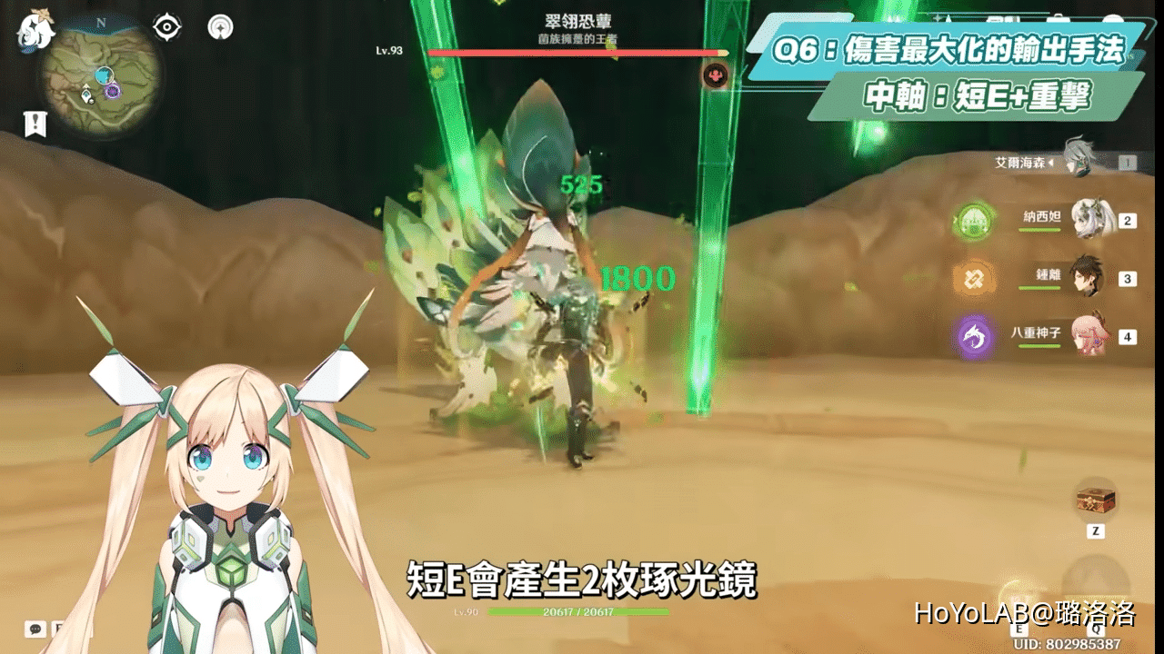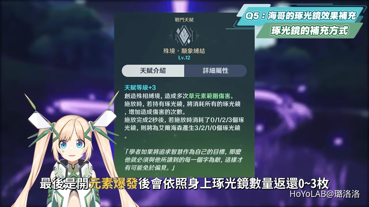 元素戰技是海哥的核心天賦,這邊洛洛也再補充關於琢光鏡的一些機制效果,琢光鏡的主要作用為轉化攻擊為草元素附魔、並且在戰鬥過程中進行協同攻擊,也會依照身上持有琢光鏡的數量來決定傷害量,最多持有3枚琢光鏡。當持有的琢光鏡數量不同,傷害的方式也會有所不同。
