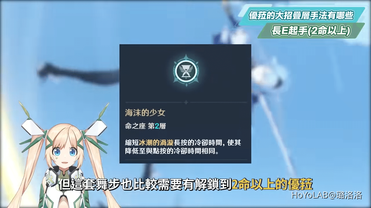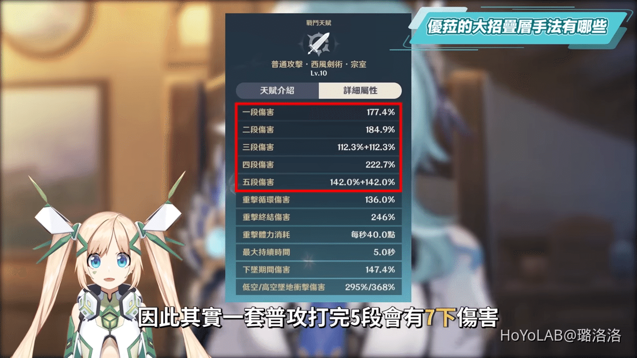 接下來就是進入到優菈的大招疊層舞蹈教室,如果還沒看過最一開始的舞蹈教學的話,可以先回去複習洛洛先前製作過的優菈角色全分析影片,了解舞步的機制。優菈的疊層有很多種,不過在米卡加入後有攻速的提升後,能夠更穩定的疊加在15層或以上,而若是搭配滿精松籟的話,則幾乎都可以打滿15~16層以上,這邊洛洛主要分享一些自己覺得比較順手的手法。首先可以在優菈的普攻天賦這邊看到,普攻一共有5段,在第3段普攻與第5段普攻的部分有兩次傷害,因此其實一套普攻打完5段會有7下傷害,在第4段會有一小段後搖,在第5段、第7下的時候會有後搖,因此盡量讓第5段留在最後或是過程中快速接戰技或衝刺取消後搖,而大招光劍開下去後就會開始計算層數,但會有0.1秒的計算冷卻時間,因此在開大後不用急著就開始普攻或放戰技,可以稍微抓一點0.1秒的小節拍再開始跳,隨著優菈身後的光劍逐漸長長,也代表著層數開始計算,當光劍型態越來越完整時,也代表層數越接近30層,這段期間不論是普攻還是戰技命中敵人都會算層數,要注意一定要命中敵人,如果在那邊揮空劍裝忙的話是不會被計算的,另外如果是命中深淵法師的護盾,也是不會計算層數的,要特別注意,而戰技長按時總共會有3下傷害,分別是第一下命中、以及會由左右兩邊往下插下大劍的兩次傷害,同時附加降低物抗與冰抗效果。