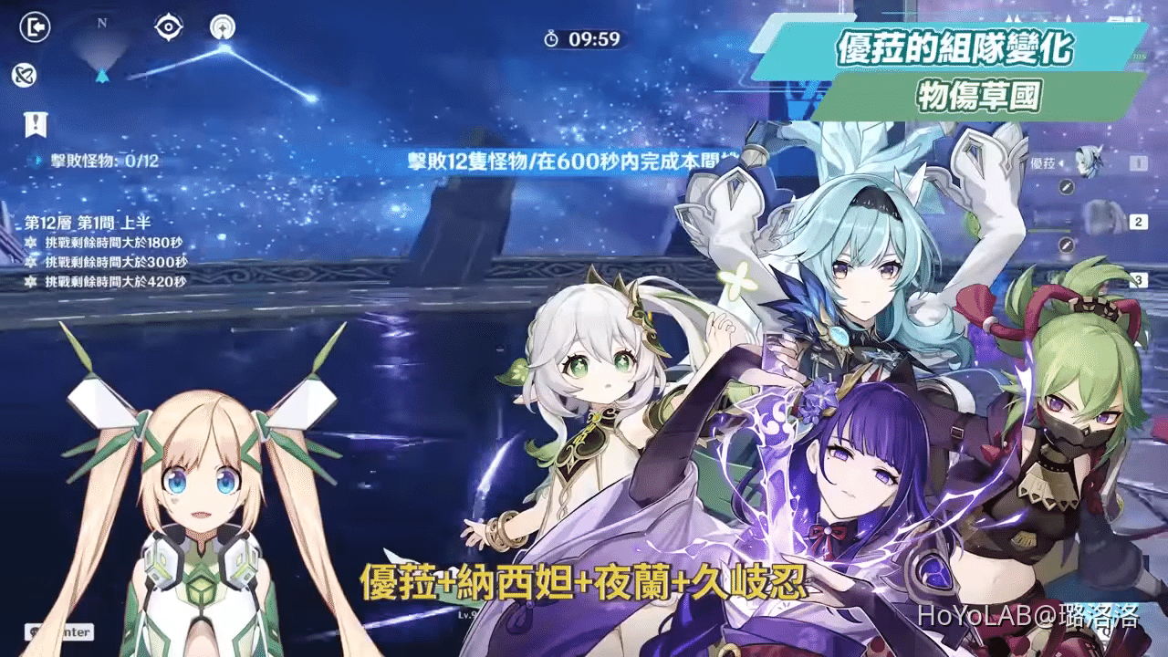 最後就是優菈加入草國隊的陣容組成,優菈+納西妲+夜蘭+久岐忍,這隊的好處是主要傷害不是優菈在扛,每個人都有傷害,並且優菈擔任草國隊的駕駛員時也不會和草元素反應互搶,也適合給一些非滿命的優菈一個下限較高的組隊方式,不過以草國隊來說還有其他更適合的駕駛員,所以優菈搭配草國隊主要是讓優菈的組隊有更多的變化性,這一隊中假如納西妲有2命的話,還能夠透過激化反應給敵人降低防禦30%,能帶來非常可觀的傷害,久岐忍的掛雷也能提供給優菈做超導、夜蘭的大招也能給優菈做增傷,同時搭配草國隊總體的傷害,也是一個能攻略深境螺旋的低命優菈組隊選擇,也因為優菈不再是主要傷害擔當,若是元素充能不夠的話也可以考慮使用充能主屬性的大劍。