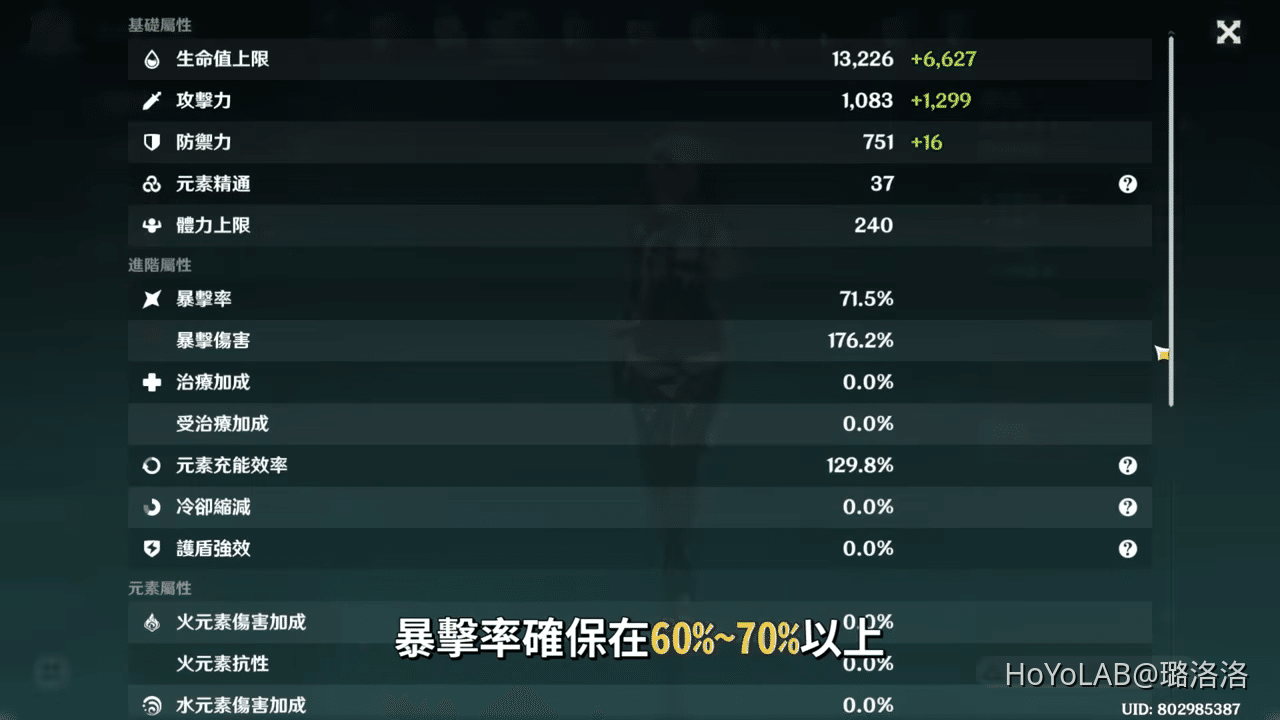 優菈的畢業面板參考,暴擊率確保在60%~70%以上,因為大招萬一空大就尷尬,所以建議是70%以上最好,暴擊傷害則可以在150%~200%左右,攻擊力若是拿專武松籟或是狼的末路大概可以來到2300~2400左右,而若是非專武則會建議攻擊力最少在2000以上,也因為優菈是主靠大招打傷害的,能量需求80點的優菈也可以靠副屬性加減堆疊一些元素充能效率,大約可以堆到120~130%左右,不太建議直接穿充能沙,用副屬性的即可。