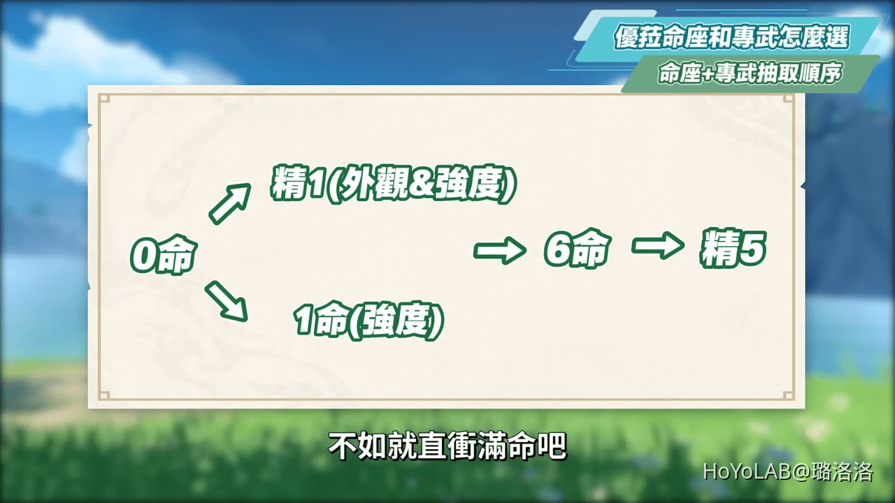 這邊也稍微總結優菈命座和專武的抽取建議,首先拿到0命優菈後,主要可以看自己身上有沒有替代的武器,洛洛自己比較推薦的會是狼的末路、葦海信標、無工之劍等等,比較愛漂亮的話還是推薦抽專武松籟響起之時,加上這次很多抽優菈的說不定也不是為了強度,說不定這次武器池走了之後也不知道要多久才能看到松籟了,而若是有替代武器,想再追求傷害上限,則可以考慮先往1命抽,專武和1命主要就是看自己追求傷害還是外觀,最後就是建議直衝滿命和滿精煉武器,既然都決定抽貴族了,那麼想追求核爆的極致,不如就直衝滿命吧,不直接衝滿命的話,還不如把那些原石留著抽楓丹的新角色或**輔助角。