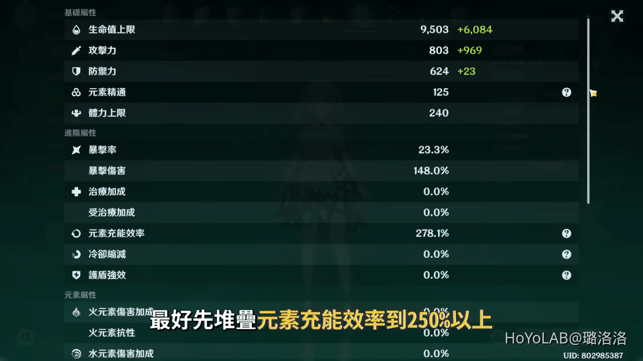 也因為通常使用流浪者就會再推薦搭配滿命琺露珊,因此這裡洛洛也順便補充一下關於滿命琺露珊的畢業面板參考,作為風隊專屬的琺露珊,最為關鍵的就是最好大招要能夠無縫連開,而以大招需求80點能量的琺露珊,最好先堆疊元素充能效率到250%以上,直到你在深境螺旋實戰過程中能夠在冷卻時間好之後、大招能量也好了,其他就是再堆疊基礎攻擊力來增加天賦轉化的增傷。不過通常以萌新來說,光是堆元素充能面板就已經十分吃力,加上非滿命的琺露珊在回能的時候,需要先開E戰技,再透過蓄力射箭命中敵人施加「風壓坍縮」的效果來吃到能量微粒,會有點類似非滿命的九條裟羅一樣回能過程十分卡手,在面對一些給能量微粒少的敵人時,充能面板甚至有可能會需要堆到270%以上才夠用,滿命的琺露珊大部分只要直接開Q就好,因此在琺露珊的培養重點上,主要的面板追求就是元素充能。
