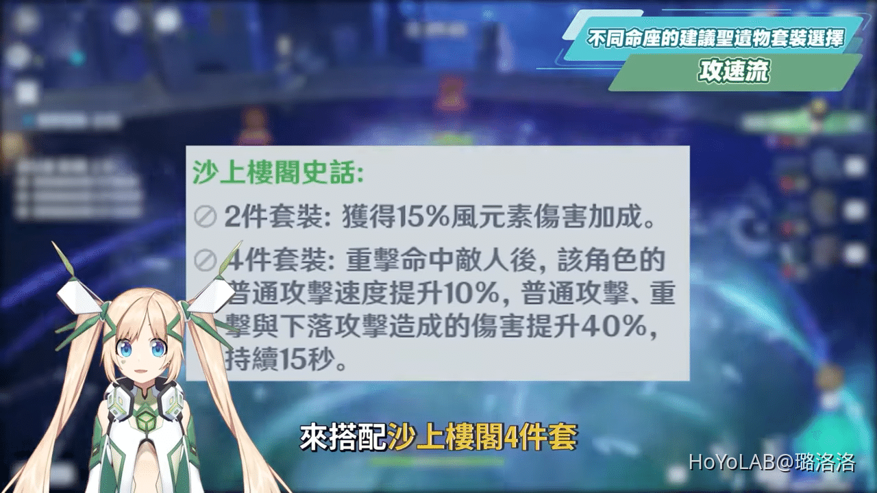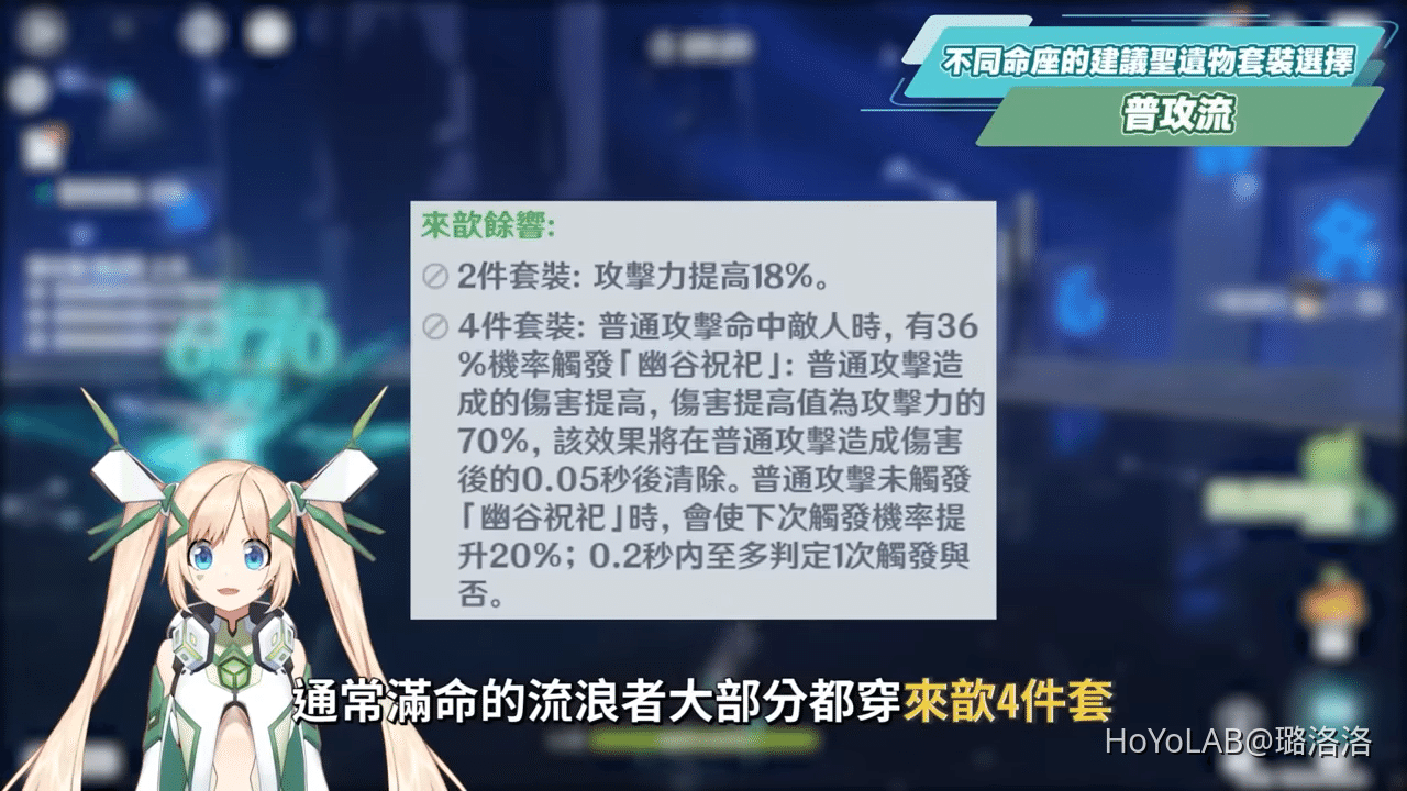 主打普攻的除了沙上樓閣4件套外,通常滿命的流浪者大部分都穿來歆4件套,因為滿命的額外強化普攻也能吃到來歆餘響4件套的效果,所以總體傷害會比起穿沙上4件套的傷害上限要再高上一些。