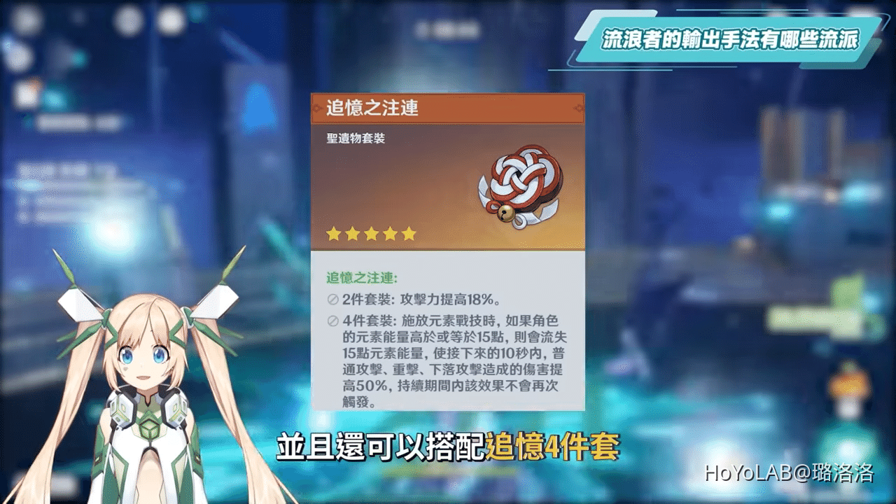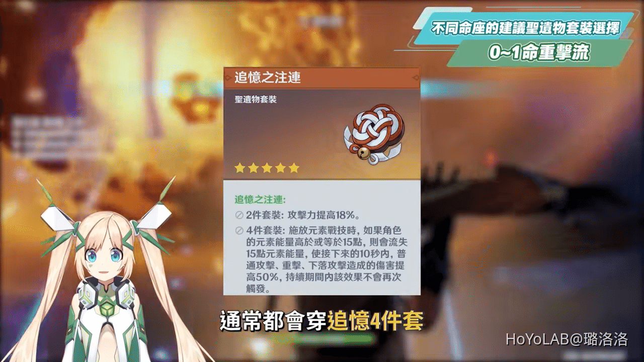 以0~1命的重擊流流浪者來說,通常都會穿追憶4件套,雖然副作用是開E技能後會讓大招能量減少一些有點卡卡的,但追憶所帶來的重擊傷害加成是很可觀的,2件套也還能再增加攻擊力,並且在刷追憶的時候,另外一個能掉落的絕緣4件套也是很多角色都能搭配的聖遺物,因此在這邊刷聖遺物也是一個CP值不錯的選擇。