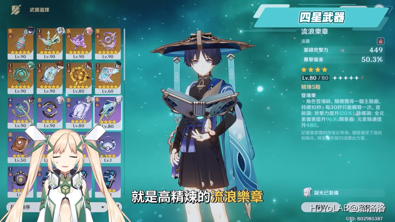 四星武器裡面最為推薦的就是高精煉的流浪樂章,三種效果搭配流浪者都有作用,並且主屬性也提供大量的暴傷加成,若是打重擊流也可以用活動限定武器嘟嘟可故事集,或是紀行武器可以拿到的匣裡日月等等。