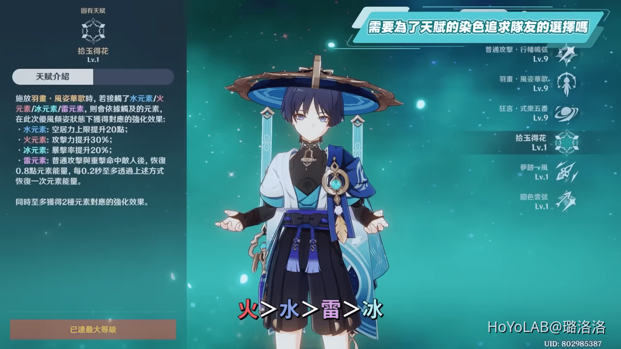 在流浪者的固有天賦「拾玉得花」中,若是流浪者接觸了水、火、冰、雷這些元素時,最多可以獲得2種對應元素的強化效果,可以在流浪者開E後的光環上觀察獲得哪一種元素的強化效果,以觸發BUFF的元素優先級別分別是:火>*>*>冰。若是接觸火或是冰元素這種加攻和暴率的BUFF,會直接顯示在角色面板上。另外也因為當怪物凍結時,身上是有水+冰元素共存的,這時流浪者在怪物身旁開E時可以剛好同時染上水和冰元素,而像是班尼特開Q後會使角色直接上火附著這類的BUFF,也能直接讓流浪者染上火元素進而獲得加攻BUFF。