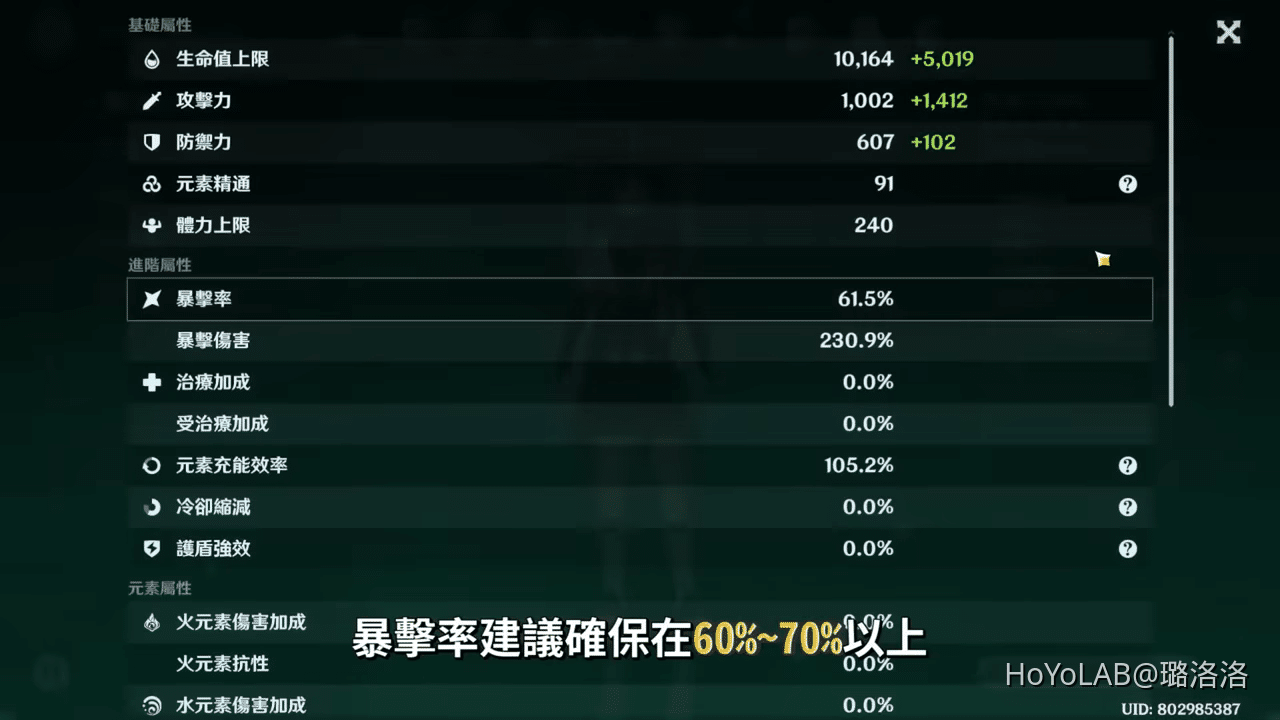 流浪者的畢業面板參考,暴擊率建議確保在60%~70%以上,而暴傷建議可以在170%~200%以上,攻擊力建議在2200以上。若是未達2000的流浪者,會建議綁定班尼特來提供大量的攻擊加成,通常有拿專武或是加雙暴主屬性的武器來說,畢業門檻不算難,比較容易缺少的可能會是攻擊力的部分,因此最好再多從聖遺物副屬性多堆一些攻擊力。