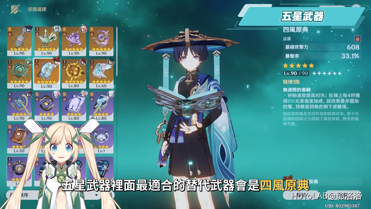 五星武器裡面最適合的替代武器會是四風原典,隨著站場時間越長,元素傷害能得到更多提升,並且主屬性提供暴率也是比較珍貴的屬性,另外也能使用神樂之真意,雖然武器效果的層數比較不容易吃滿,但主要是憑藉著高額的暴傷加成,以及高白值的攻擊力,而其他還有像是天空之卷,以及需要綁定盾輔角色的塵世之鎖等等。但搭配這種攻擊力主屬性的武器,在聖遺物的雙暴面板上就要多堆疊。