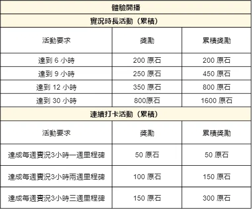 d.活動期間,參與者需在Twitch《Genshin Impact》分類下實況,且實況時數不得低於6小時,才能獲得「體驗開播」與「進階衝榜」獎勵資格。