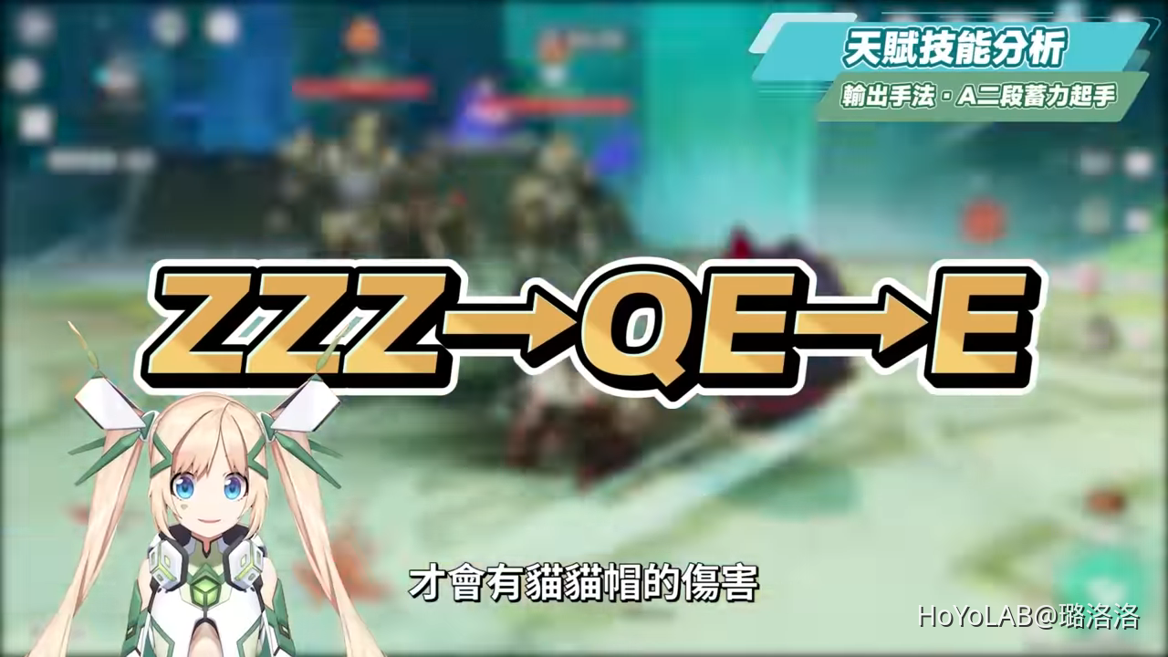若是二段蓄力起手,前面先放持續治療角色的恢復技能提供持續回血環境,接著是二段蓄力重擊2~3次,等到元素爆發能量滿後開Q,接著點按E解除Q狀態,再施放一次E戰技收尾。重擊起手的話需要在第二次重擊才會有貓貓帽的傷害,通常可能是Q大招能量還沒滿時的起手方式。
