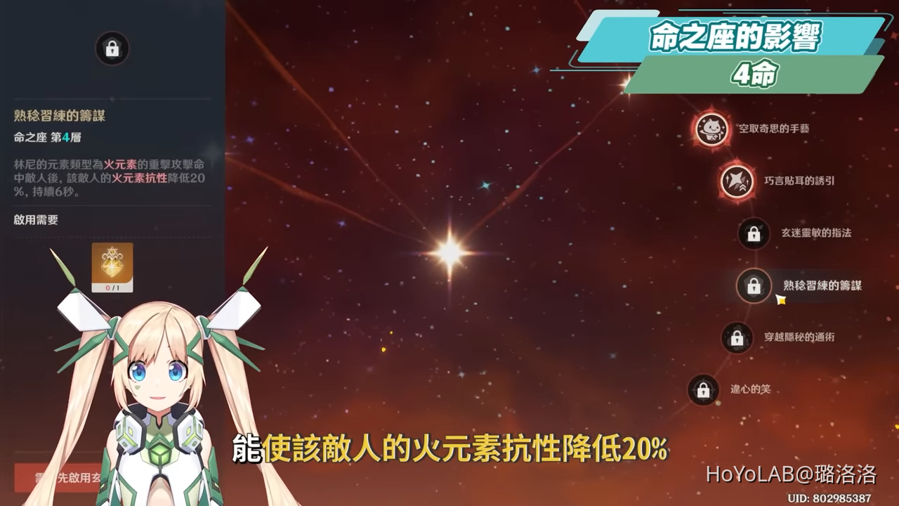 解鎖4命後,使林尼在以火元素重擊的攻擊方式命中敵人時,能使該敵人的火元素抗性降低20%,持續6秒,抗性乘區也是提高傷害的重要區塊,也等於能夠提高林尼的傷害,屬於增傷命座,同時這個效果也能夠使其他隊伍中的火元素角色受益,讓林尼在純火隊中不只提高傷害,也輔助了其他的火元素隊友。
