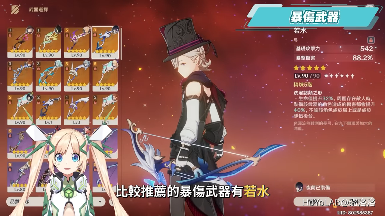 比較推薦的暴傷武器有若水,只是若水的攻擊力白值比較低,需要在攻擊力面板再多堆疊,另外還有飛雷之弦陣、黑岩戰弓,星級越少白值也越低,因此在挑選時也要注意攻擊力面板是否過低。