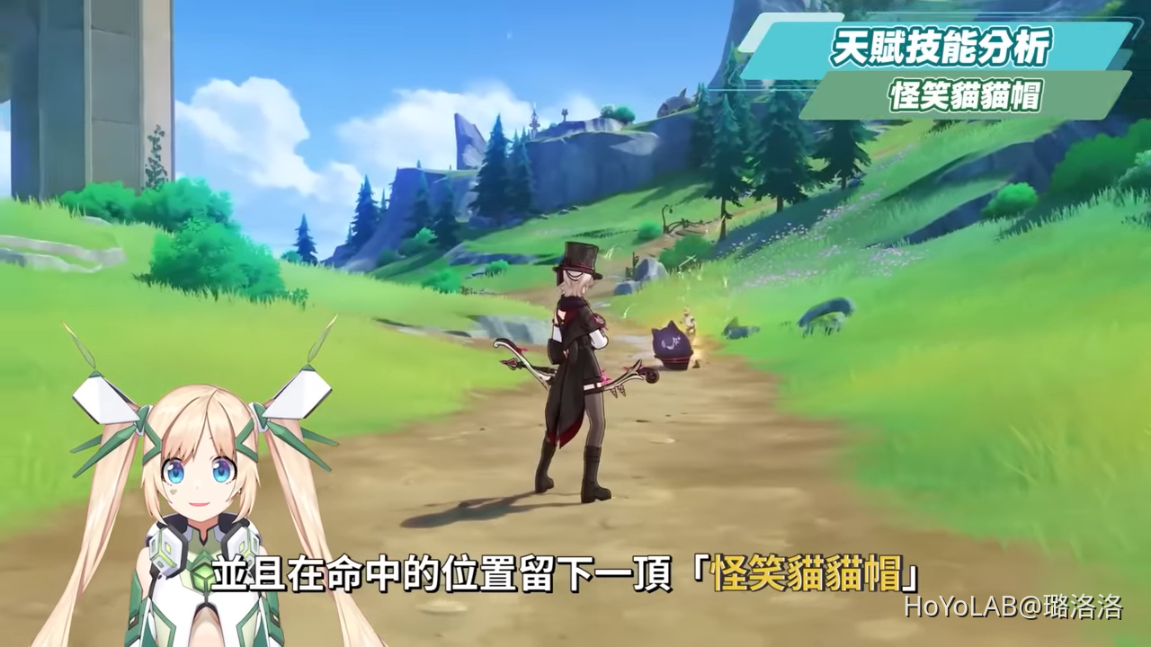 而若是林尼在發射二段蓄力箭矢時,身上的生命值高於60%,將會消耗20%生命值,並獲得1層「隱具層數」,最多可以疊加5層,並且在命中的位置留下一頂「怪笑貓貓帽」。怪笑貓貓帽可以嘲諷附近的敵人,吸引敵人攻擊,每個敵人每5秒只能被貓貓帽嘲諷一次,不會持續嘲諷,能夠保護低抗打斷能力的弓手林尼,貓貓帽具備基於林尼生命值部分比例上限的耐久度,在沒有解鎖1命前,場上最多只能有一頂貓貓帽,而林尼每次施放二段蓄力射箭後,都會使之前的貓貓帽消失,同時發射「禮花術彈」攻擊距離最近的一名敵人,若貓貓帽中途被摧毀或是持續時間結束後,會對周圍最近的一名敵人進行單體火元素傷害,為弱火元素附著,並能享受到林尼的重擊傷害加成。因此林尼主要的輸出方式就是除了透過二段蓄力射擊之外,還要持續刷新場上的貓貓帽進行額外傷害,並藉此疊加「隱具層數」。
