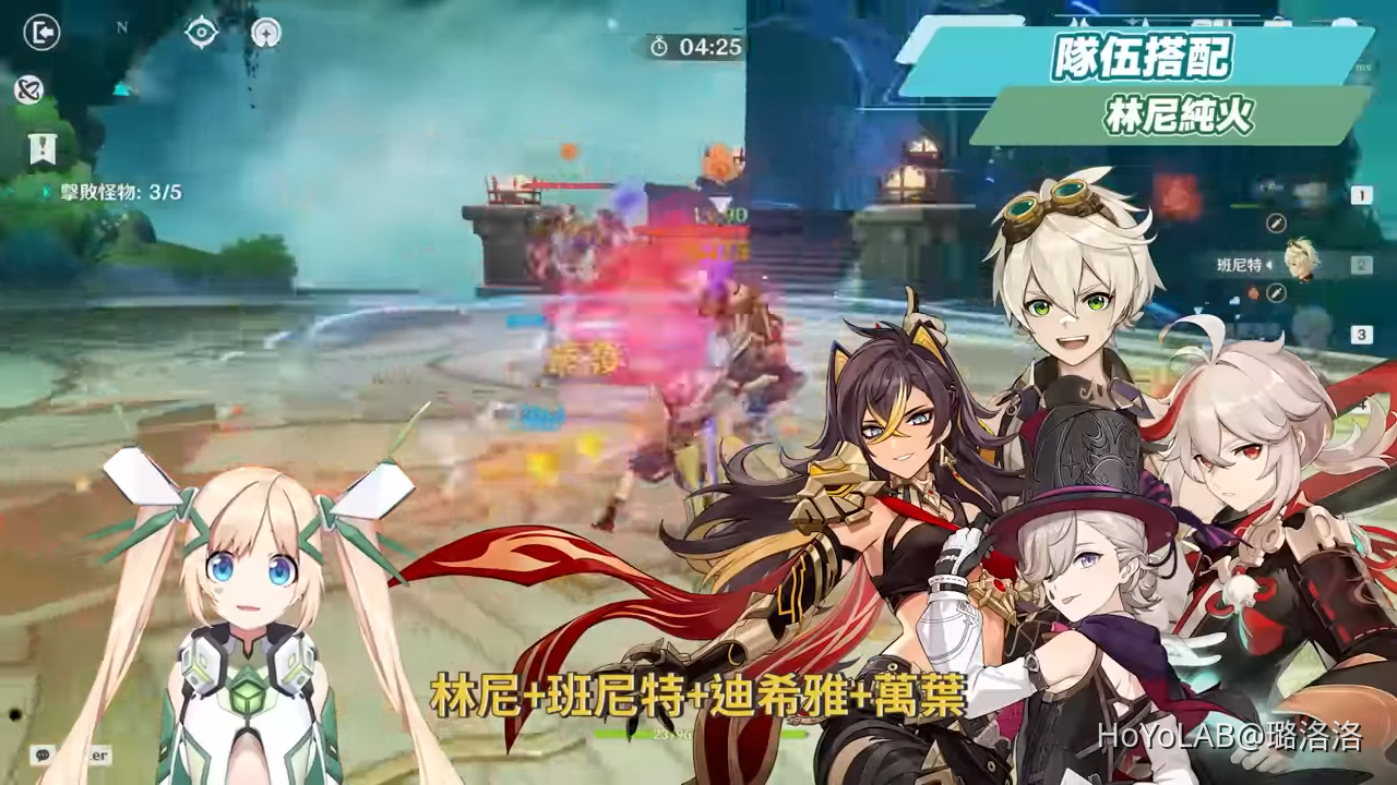 林尼純火隊的配置為林尼+班尼特+迪希雅+萬葉,迪希雅可以穿戴千岩4件套,也可以替換成其他火元素角色,像是香菱,但就會少了抗打斷作用的角色,輸出手法為:班尼特QE→萬葉QE→迪希雅E→林尼QE→3次二段蓄力→E。