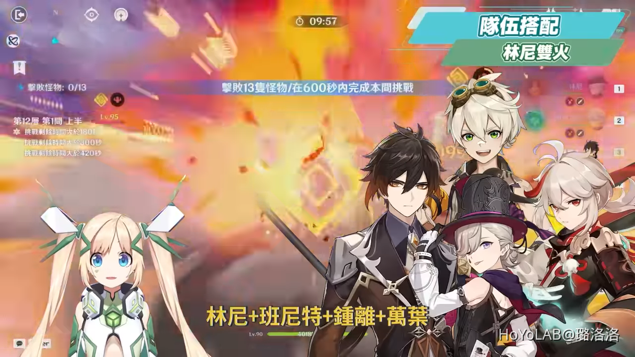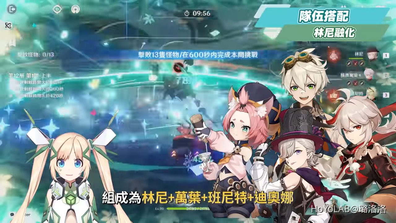 林尼雙火隊的配置為林尼+班尼特+鍾離+萬葉,搭配鍾離+萬葉雙減抗以及最強護盾與增傷的加持下,是非常穩定且實戰非常安逸的一隊陣容,果然不愧是**角,洛洛在用這一隊時,林尼天賦都沒升的情況下也隨便打5萬以上,非常可怕。輸出手法為鍾離長E→班尼特QE→萬葉QE→林尼QE→3次二段蓄力→E。
