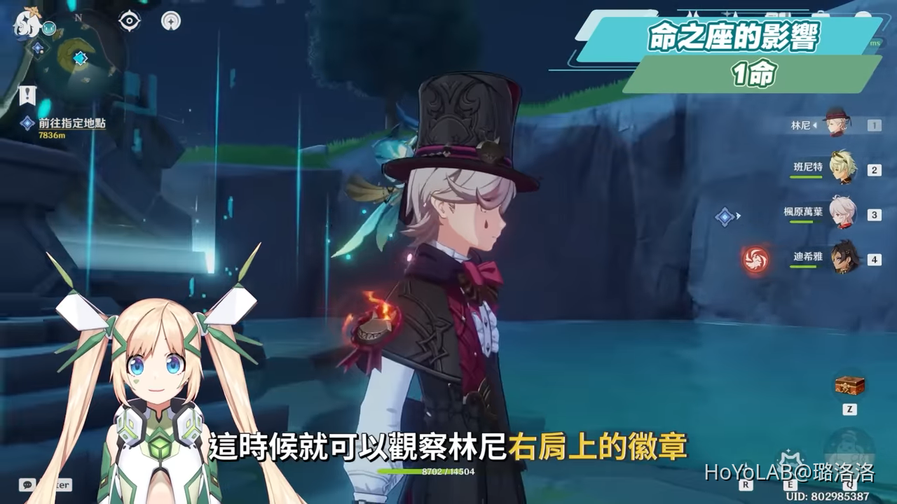 解鎖1命後,能使林尼的戰技所召喚出的貓貓帽由1頂變為2頂上限,並且多1層「隱具層數」,每15秒觸發一次,使我們在疊層的效率上更加優化,也讓貓貓帽能多一次額外的禮花術彈傷害。在沒有解鎖1命的情況下,比較不容易在班尼特大招持續時間內疊滿層,大多疊到4層就差不多,但解鎖1命後搭配班尼特只要Q→二段蓄力3次→E收尾,都能穩定吃滿5層「隱具層數」。而要如何知道當前戰技所施放的貓貓帽會不會多一層額外層數?這時候就可以觀察林尼右肩上的徽章,當徽章上有火光特效時,代表額外層數的冷卻已經準備就緒,這時發射的二段蓄力就會有2頂貓貓帽、以及一次疊加2層「隱具層數」,也讓林尼有一個命座解鎖的外觀特效。