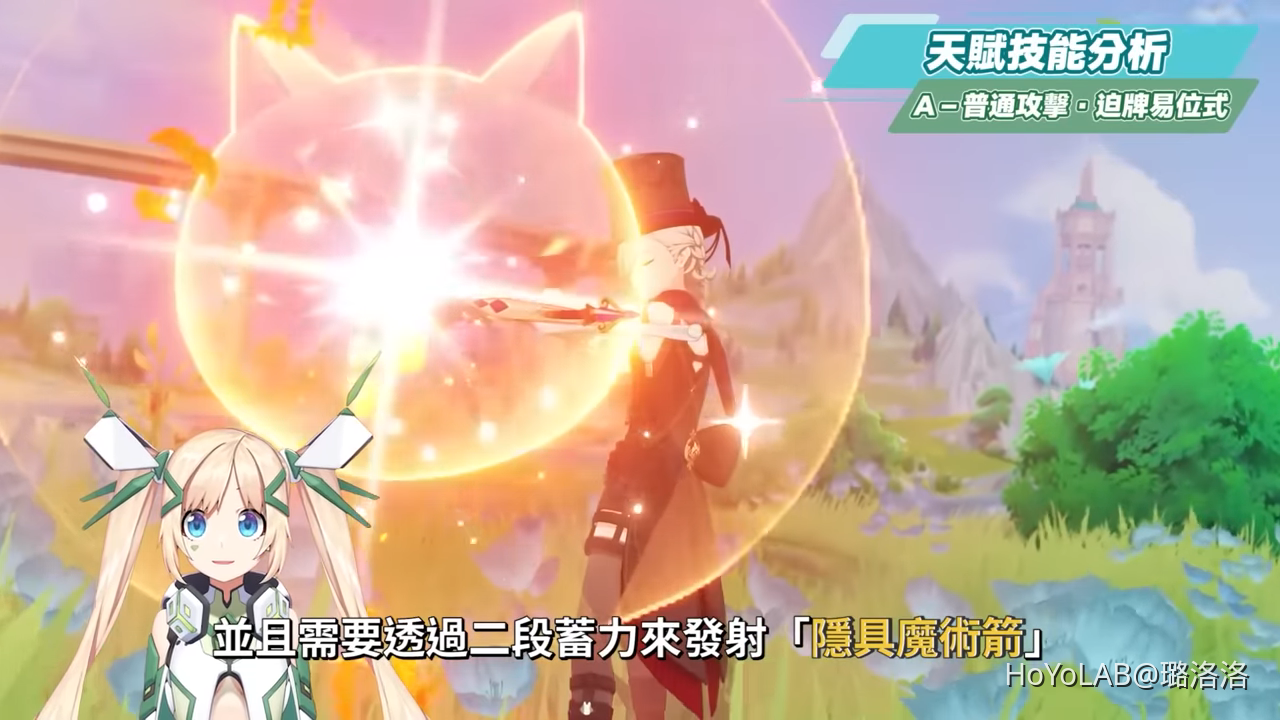 林尼的普攻一共4段,雖然不是實戰中主要的輸出方式,不過普攻四段的動作還蠻華麗的,可以欣賞一下。重擊的部分才是林尼的主要輸出傷害來源,並且需要透過二段蓄力來發射「隱具魔術箭」,二段蓄力約需要0.8秒,完成蓄力會有2段音效能夠辨別,並且會有一個貓咪外框的圖案往外發散,類似於甘雨和提納里的二段蓄力模式,而兩段不同蓄力所發射出的火元素箭矢都是弱火元素附著。