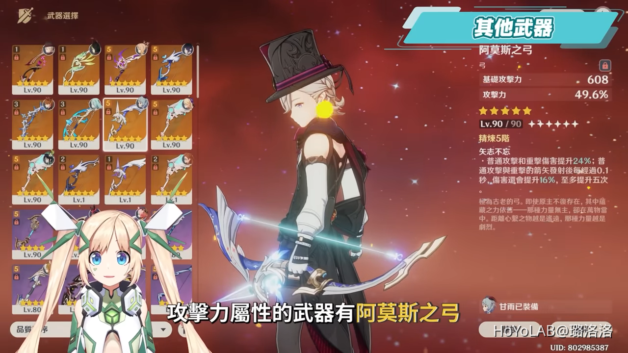 攻擊力屬性的武器有阿莫斯之弓、試作澹月、破魔之弓,暴擊率主屬性的有冬極白星、天空之翼、獵人之徑、新的紀行武器烈陽之嗣、靜謐之曲,三星武器有彈弓、信使、神射手之誓等等。比較偏向前期過渡使用。