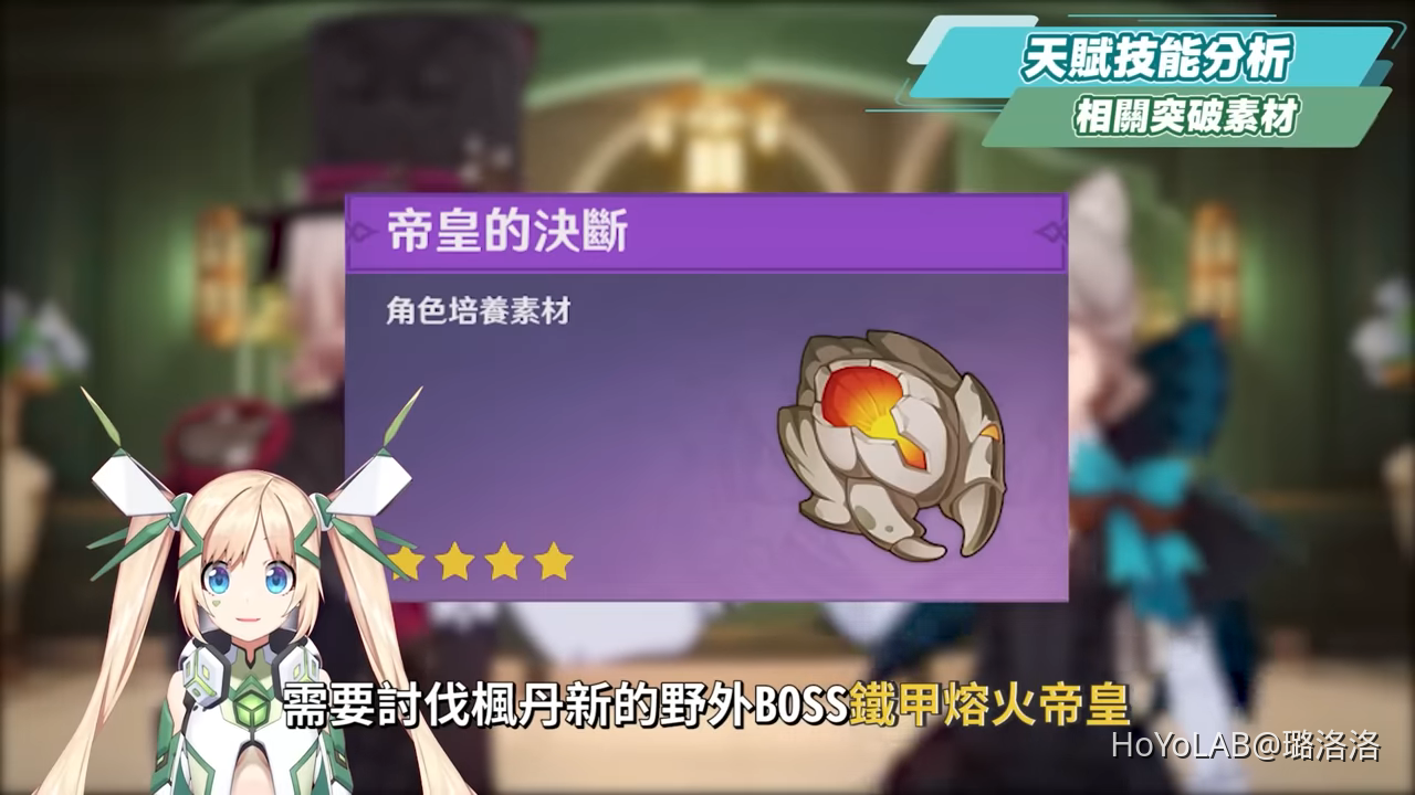 林尼的等級突破素材需要討伐楓丹新的野外BOSS鐵甲熔火帝皇,取得帝皇的決斷,以及楓丹特產虹彩薔薇,另外還有討伐愚人眾掉落的徽記,天賦突破素材為周一/四/日開放的公平系列,若是天賦技能6以上,則會需要消耗翠草之龍.阿佩普所掉落的原初綠洲之初綻。