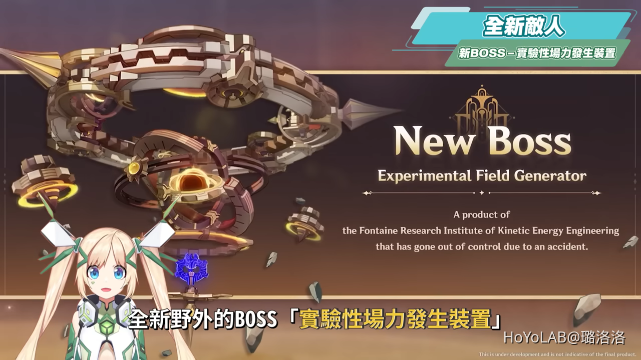 全新野外的BOSS「實驗性場力發生裝置」,從畫面中可以觀察到BOSS身上也具備荒芒屬性弱點,可以透過楓丹角色的始基力來對應之外,前瞻也提到需要運用BOSS的「失重」效果來跳躍躲避攻擊。