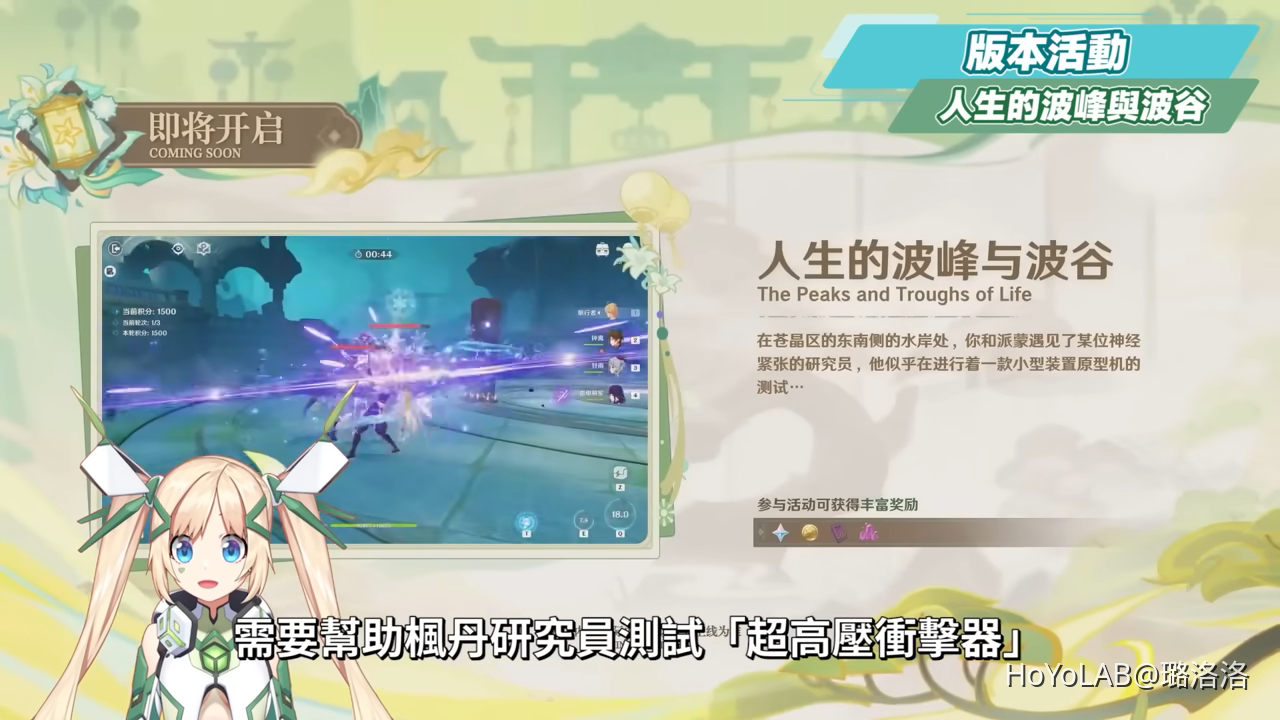 人生的波峰與波谷是一個挑戰活動,需要幫助楓丹研究員測試「超高壓衝擊器」,看準時機來停止增壓,並提高超高壓衝擊器所釋放的「超高壓衝擊波」來擊敗敵人。而旅行者也可以根據隊伍中出戰的角色數量和等級來獲得「載荷」,用來搭配更高的「增益模組」來挑戰更高難度的敵人。