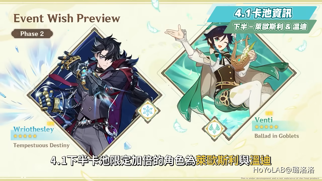 4.1下半卡池限定加倍的角色為萊歐斯利與溫迪,萊歐斯利為近戰冰元素輸出角色,溫迪則是最強聚怪龍捲風輔助,想加速深境螺旋11層前的通關速度與效率,有個0命溫迪還是很不錯的,相關的復刻Q&A也可以參考先前洛洛製作過的影片,而萊歐斯利的實測與抽取建議洛洛會在版本更新後製作相關影片。