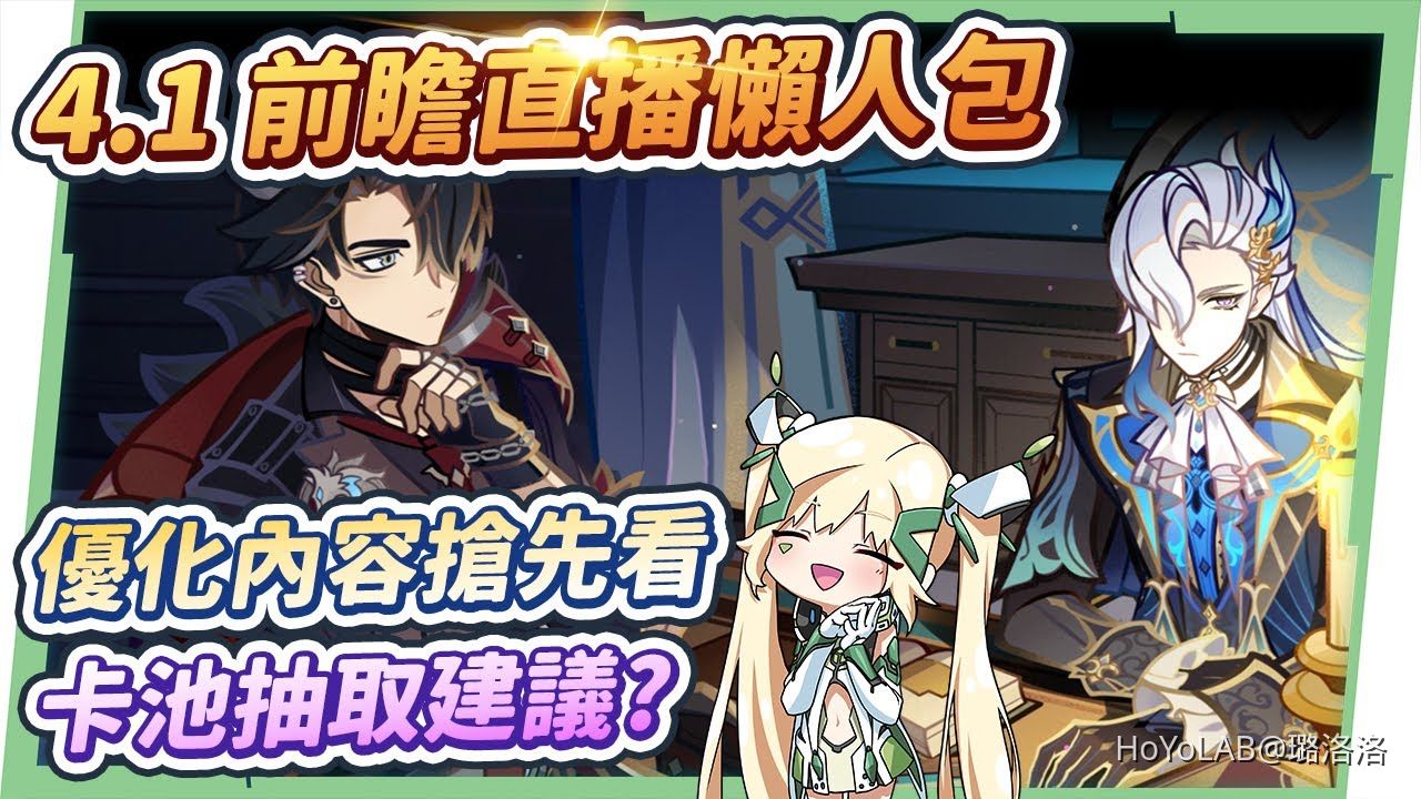 這次要帶來的是《原神》4.1前瞻直播重點懶人包,同時《原神》也將迎來3週年啦!在版本更新後不只會有免費20抽可以領取之外,首儲雙倍也即將重置,因此打算抽這次4.1上下半卡池的兩位強力男性角色,又或是要往後等水神的話,可不要錯過啦,除了兩位新的楓丹五星角色推出之外,4.1也將會復刻胡桃與溫迪,相關的抽取建議洛洛也會分享在稍後的影片內容中,此外官方也釋出了新的楓丹區域以及新BOSS,是要抽取新角色時不能錯過的突破素材來源,滿滿的活動內容記得把握把原石撈好撈滿,並且在版本更新前有時間的話也可以多看幾次懶人包哦,此外也會提供詳細的卡池資訊、新區域、新敵人、新武器、版本活動、系統優化,以及其他新內容補充唷!