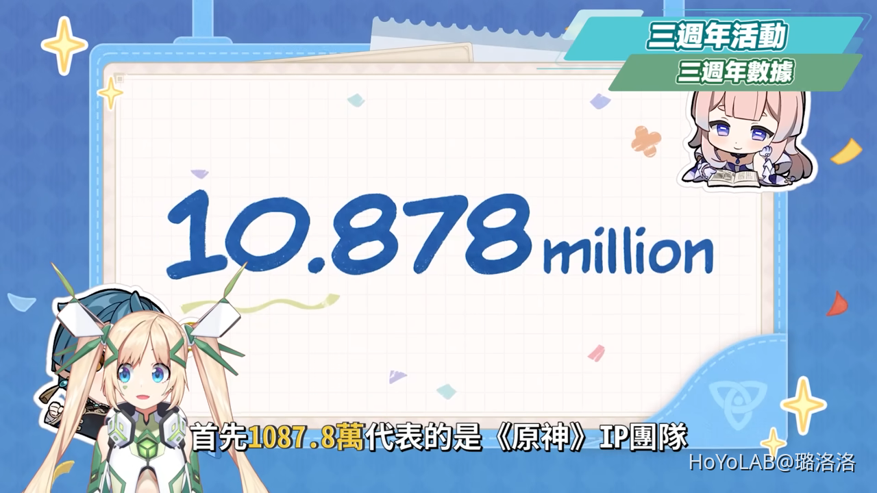 在前瞻直播中也補充了一些三週年以來的相關數據,首先1087.8萬代表的是《原神》IP團隊在遊戲內外創作敘述文本總字數量,不得不說米哈遊的文案量還有一些遊戲道具的敘述、圖鑑裡面從植物到動物,到一些大大小小的道具,都有非常細的文本,甚至是撿到的書籍,真的都像在看短篇小說一樣,也會有一些彩蛋藏在裡面,例如「深海龍蜥.吞雷」的圖鑑敘述就提到,新的水之龍一定會以人形降臨。而74則是目前從開服到4.1版本所累積的角色數量,而下一個215則代表著《原神》遊戲內所有最高解析度美術的資源總量,從楓丹改版以來也有很多玩家反饋遊戲容量佔據手機空間太多,為此技術團隊也表示後續會再努力探索其他的優化手段,雖然容量真的不小,不過這樣的遊戲品質要做到跨平台又要做到手機能兼容,真的不是件容易的事呀!下一個9953萬則是《原神》在全球社群平台的總追蹤人數,快要突破一億了啊,真的是個非常可怕的數字。而40億則是《原神》發布的所有官方影片總觀看次數,以及最後的1150萬則是官方每個版本舉辦的二創活動,全球參加活動的總人數,這邊只有影片分類而已就已經辣~麼多,不知道如果計算《原神》相關的迷因圖數量的話,又會有多少呢?欸嘿。