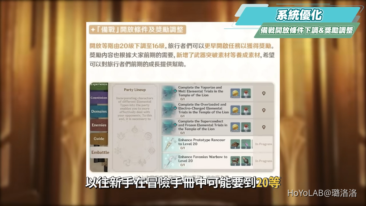在前瞻直播中沒有提到,洛洛這裡一起補充進來的重點,就是在前幾天的開發者座談會中提到的,4.1版本也將會有備戰開放條件下調的優化,以往新手在冒險手冊中可能要到20等才會解鎖一些備戰挑戰,版本更新後將會下調至16等,方便新手玩家更快得前往備戰任務中完成,並獲得對應養成素材獎勵。