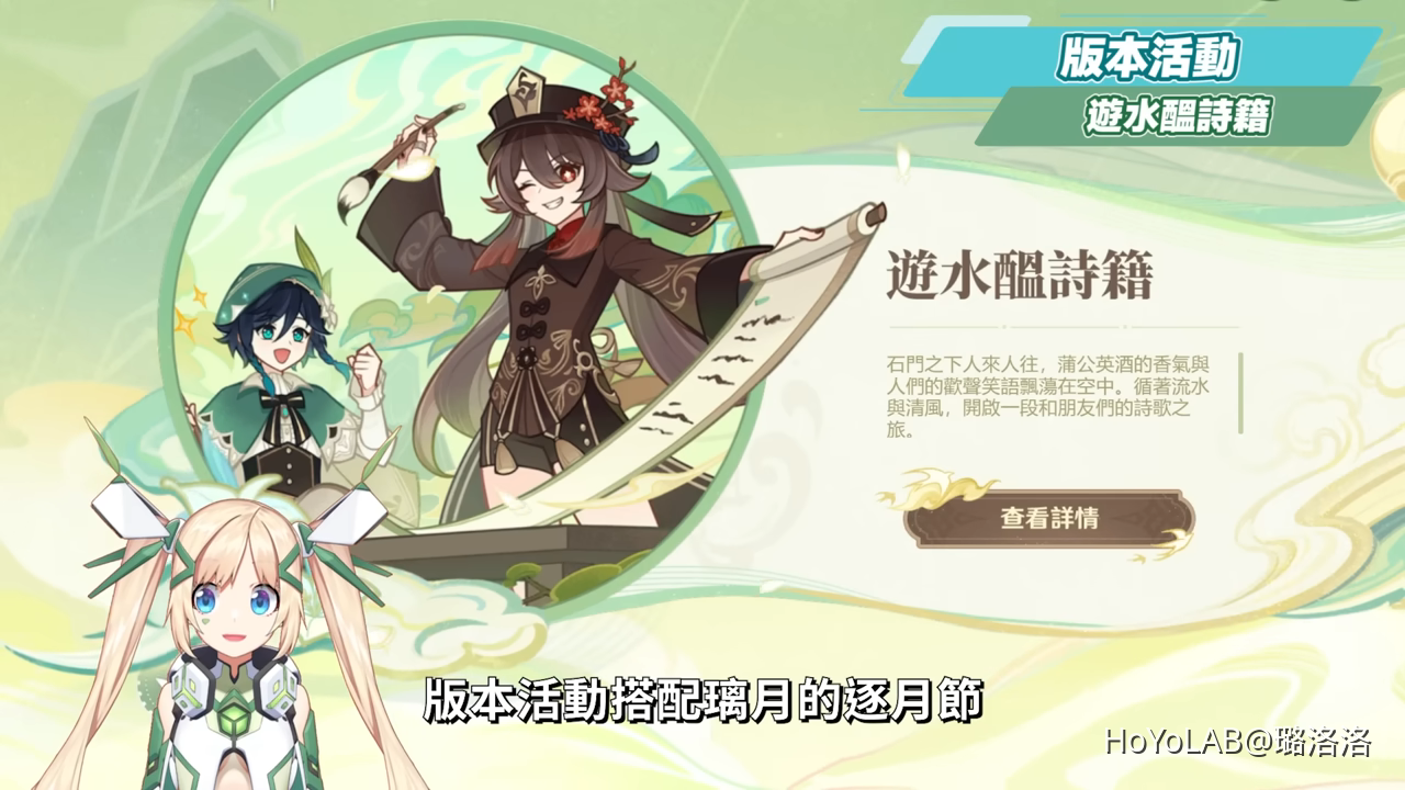 版本活動搭配璃月的逐月節,胡桃和溫迪在石門附近聯合兩國舉辦了一場詩歌大會,交流詩歌並且促進兩國發展,感受節日氛圍。在活動劇情中也會看到不少蒙德與璃月的朋友,只是身為參賽者之一的重雲提到自己先前遇到了一個類似「妖邪」的東西,因此我們也需要在活動過程中協助重雲來找到真相。完成版本活動就能免費獲得滿精煉限定活動法器「無垠蔚藍之歌」。